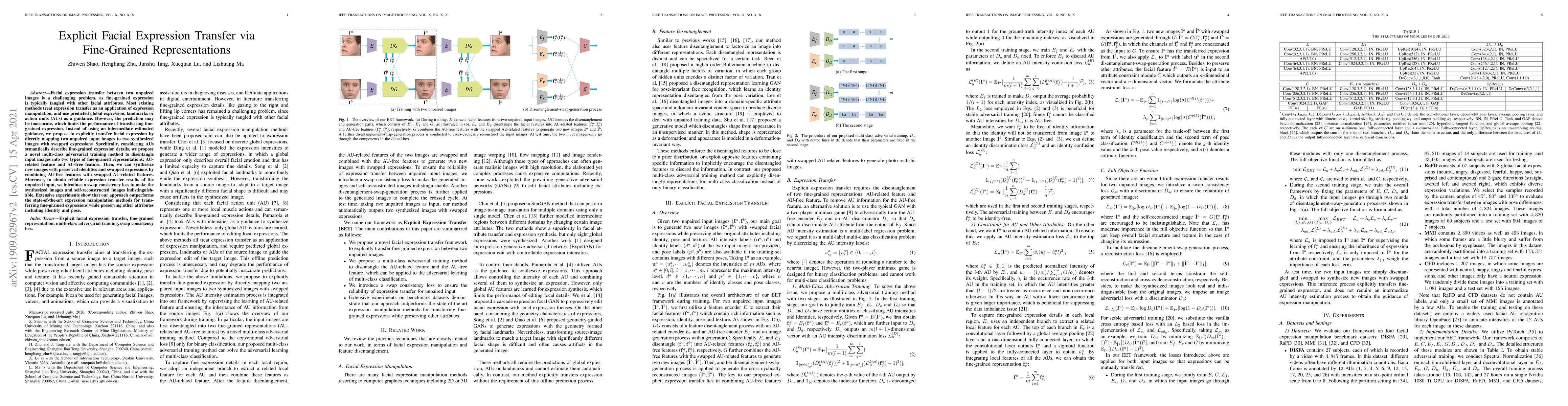 This paper proposes a method for transferring fine-grained facial expressions between unpaired images by directly mapping input images to synthesized images with swapped expressions, using a multi-class adversarial training approach to disentangle features into AU-related and AU-free representations. The method employs a swap consistency loss to ensure synthesized images are indistinguishable from self-reconstructed images, outperforming existing methods in fine-grained expression transfer.