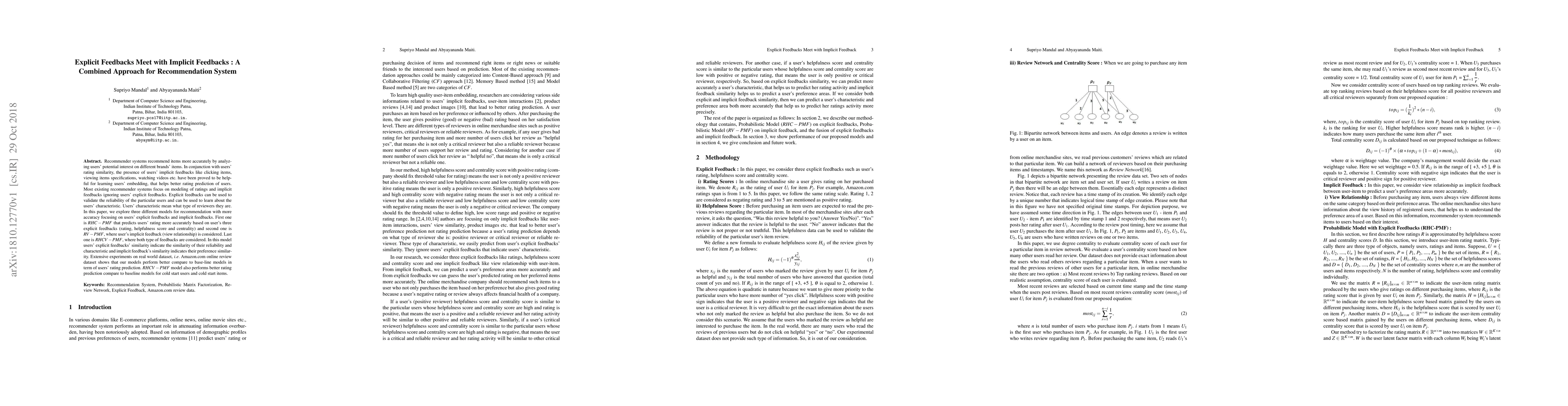 Recommender systems recommend items more accurately by analyzing users' potential interest on different brands' items. In conjunction with users' rating similarity, the presence of users' implicit feedbacks like clicking items, viewing items specifications, watching videos etc. have been proved to be helpful for learning users' embedding, that helps better rating prediction of users. Most existing recommender systems focus on modeling of ratings and implicit feedbacks ignoring users' explicit feedbacks. Explicit feedbacks can be used to validate the reliability of the particular users and can be used to learn about the users' characteristic. Users' characteristic mean what type of reviewers they are. In this paper, we explore three different models for recommendation with more accuracy focusing on users' explicit feedbacks and implicit feedbacks. First one is RHC-PMF that predicts users' rating more accurately based on user's three explicit feedbacks (rating, helpfulness score and centrality) and second one is RV-PMF, where user's implicit feedback (view relationship) is considered. Last one is RHCV-PMF, where both type of feedbacks are considered. In this model users' explicit feedbacks' similarity indicate the similarity of their reliability and characteristic and implicit feedback's similarity indicates their preference similarity. Extensive experiments on real world dataset, i.e. Amazon.com online review dataset shows that our models perform better compare to base-line models in term of users' rating prediction. RHCV-PMF model also performs better rating prediction compare to baseline models for cold start users and cold start items.