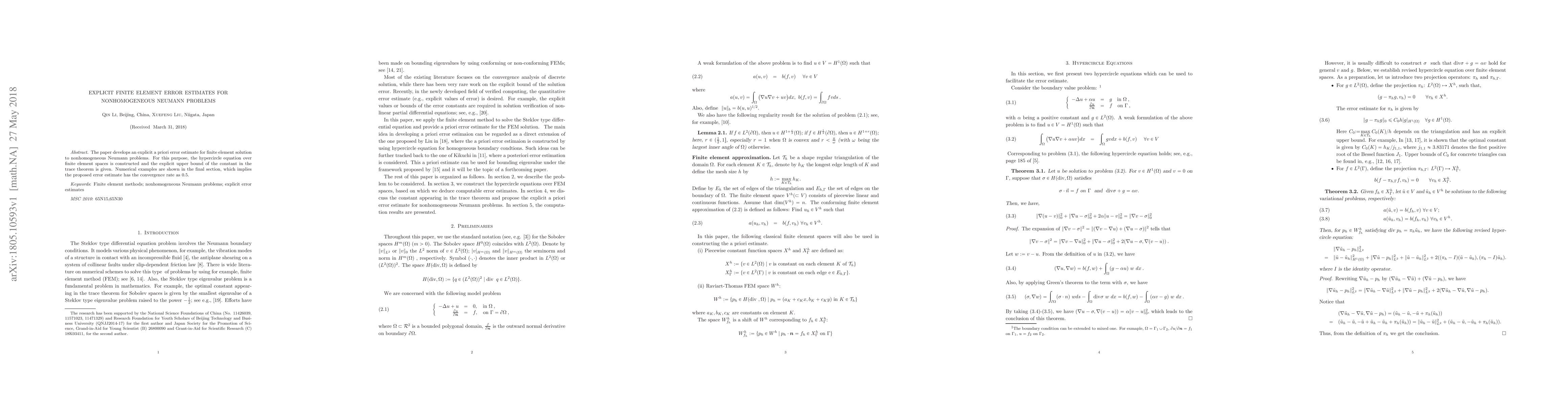 The paper provides explicit a priori error estimates for finite element solutions to nonhomogeneous Neumann problems, constructing a hypercircle equation and deriving an explicit upper bound for the trace theorem constant. Numerical examples demonstrate a convergence rate of $0.5$.
