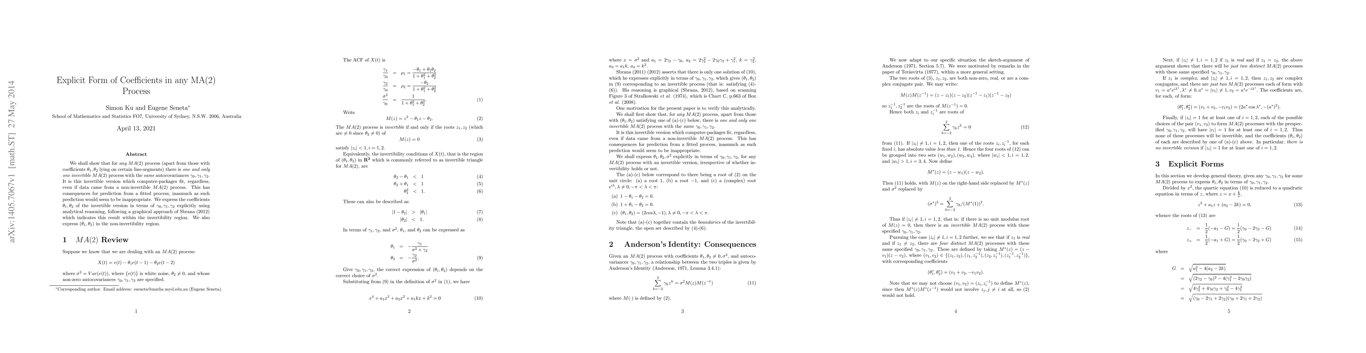 We shall show that for {\it any} $MA(2)$ process (apart from those with coefficients $\theta_1,\theta_2 $ lying on certain line-segments) there is {\it one and only one invertible} $MA(2)$ process with the {\it same} autocovariances $\gamma_0,\gamma_1,\gamma_2$. It is this invertible version which computer-packages fit, regardless, even if data came from a non-invertible $MA(2)$ process. This has consequences for prediction from a fitted process, inasmuch as such prediction would seem to be inappropriate. We express the coefficients $\theta_1,\theta_2 $ of the invertible version in terms of $\gamma_0,\gamma_1,\gamma_2$ explicitly using analytical reasoning, following a graphical approach of Sbrana (2012) which indicates this result within the invertibility region. We also express $(\theta_1,\theta_2)$ in the non-invertibility region.