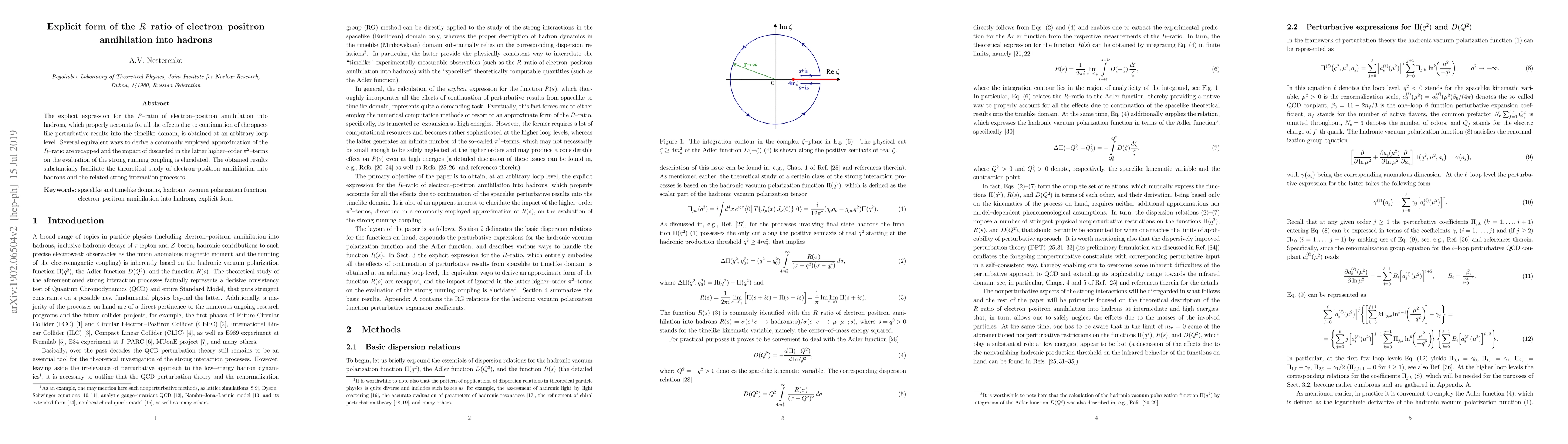 This paper provides an explicit formula for the R-ratio in electron-positron annihilation into hadrons, accounting for all effects from spacelike to timelike domain at any loop level. It also clarifies the impact of higher-order terms on the strong coupling constant, enhancing theoretical studies of related strong interaction processes.