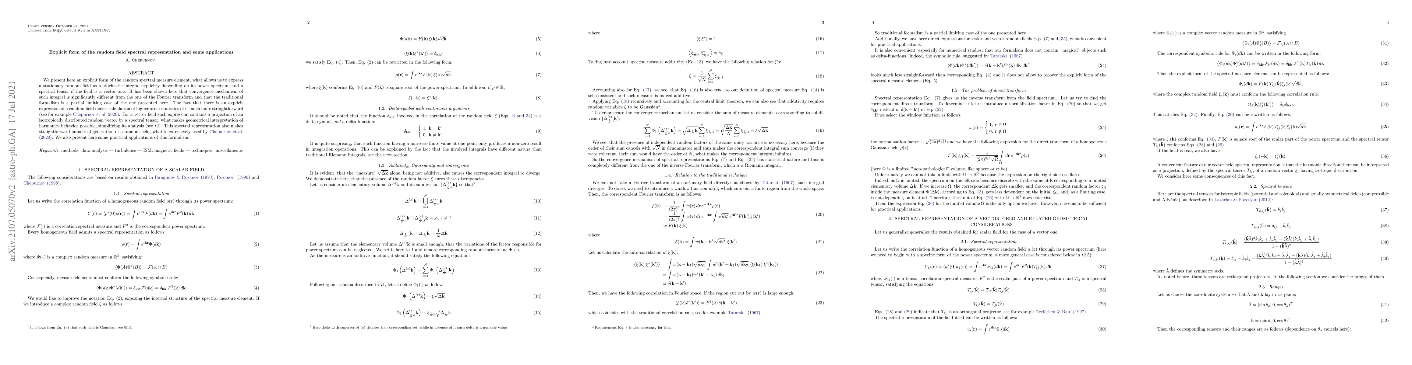 We present here an explicit form of the random spectral measure element, what allows us to express a stationary random field as a stochastic integral explicitly depending on its power spectrum and a spectral tensor if the field is a vector one. It has been shown here that convergence mechanism of such integral is significantly different from the one of the Fourier transform and that the traditional formalism is a partial limiting case of the one presented here. The fact that there is an explicit expression of a random field makes calculation of higher order statistics of it much more straightforward (see for example Chepurnov et al. 2020). For a vector field such expression contains a projection of an isotropically distributed random vector by a spectral tensor, what makes geometrical interpretation of harmonics behavior possible, simplifying its analysis (see Sect. 2). This spectral representation also makes straightforward numerical generation of a random field, what is extensively used by Chepurnov et al. 2020. We also present here some practical applications of this formalism.