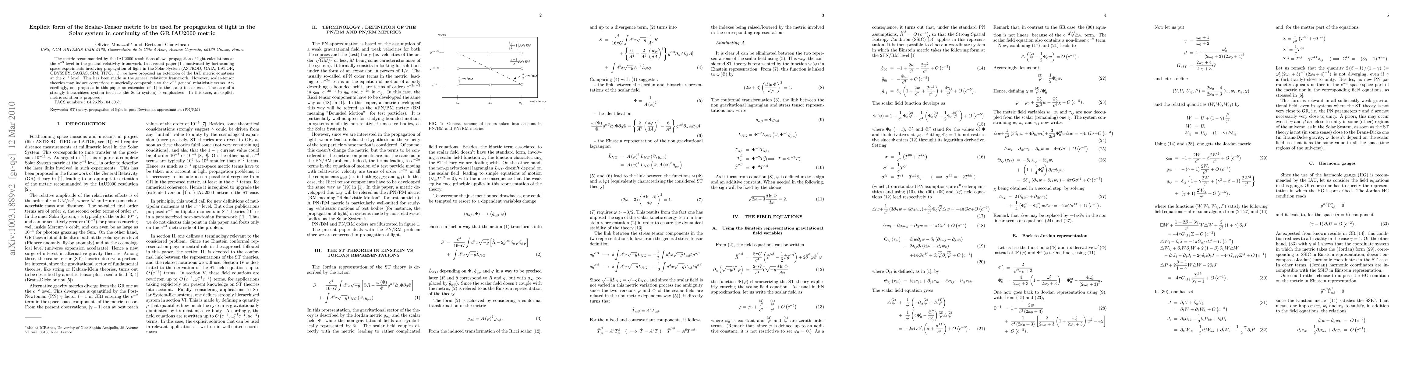 This paper extends the IAU2000 metric for light propagation in the Solar System to the c-4 level, incorporating scalar-tensor theories to account for potential corrections comparable to general relativistic terms. An explicit scalar-tensor metric solution is proposed for strongly hierarchized systems like the Solar System.