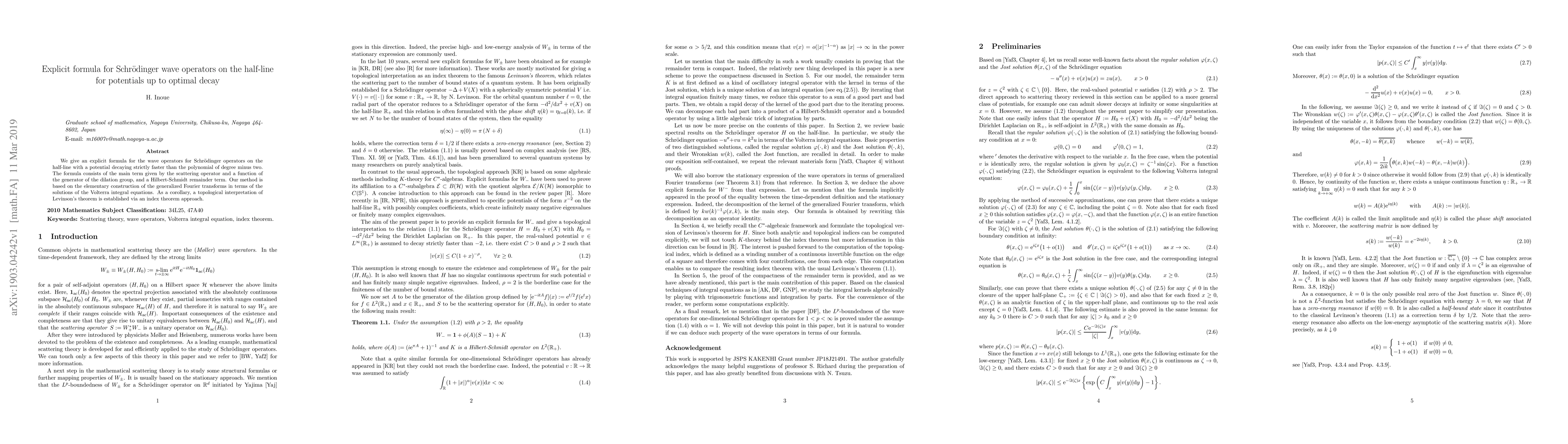 Researchers have developed an explicit formula for calculating wave operators in a Schroedinger equation with potentials that decay at an optimal rate, using the generalized Fourier transform and Volterra integral equations.