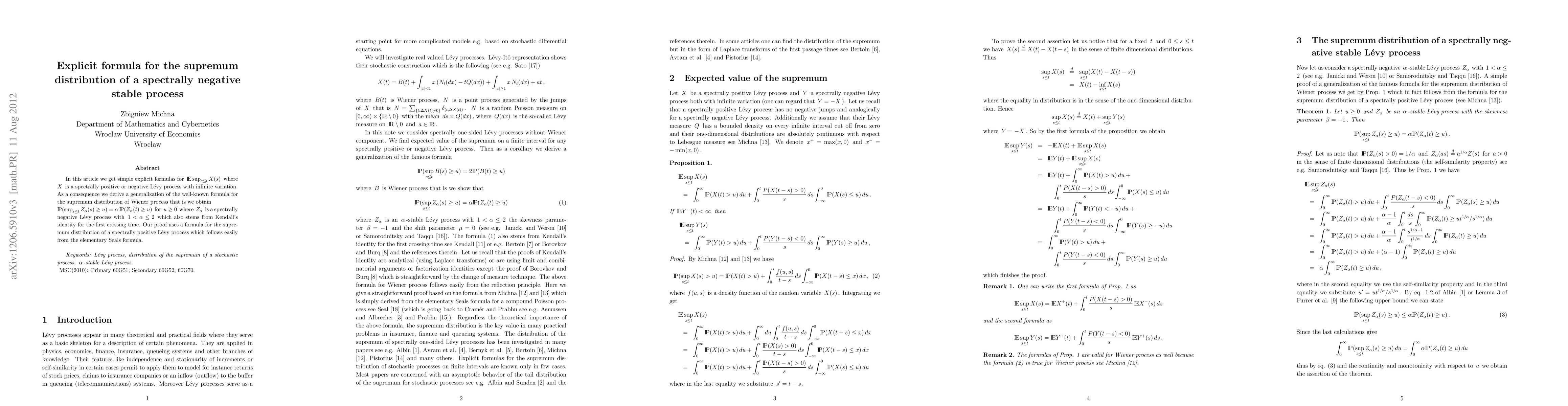 In this article we get simple explicit formulas for $\Exp\sup_{s\leq t}X(s)$ where $X$ is a spectrally positive or negative L\'evy process with infinite variation. As a consequence we derive a generalization of the well-known formula for the supremum distribution of Wiener process that is we obtain $\Prob(\sup_{s\leq t}Z_{\alpha}(s)\geq u)=\alpha \Prob(Z_{\alpha}(t)\geq u)$ for $u\geq 0$ where $Z_{\alpha}$ is a spectrally negative L\'evy process with $1<\alpha\leq 2$ which also stems from Kendall's identity for the first crossing time. Our proof uses a formula for the supremum distribution of a spectrally positive L\'evy process which follows easily from the elementary Seals formula.