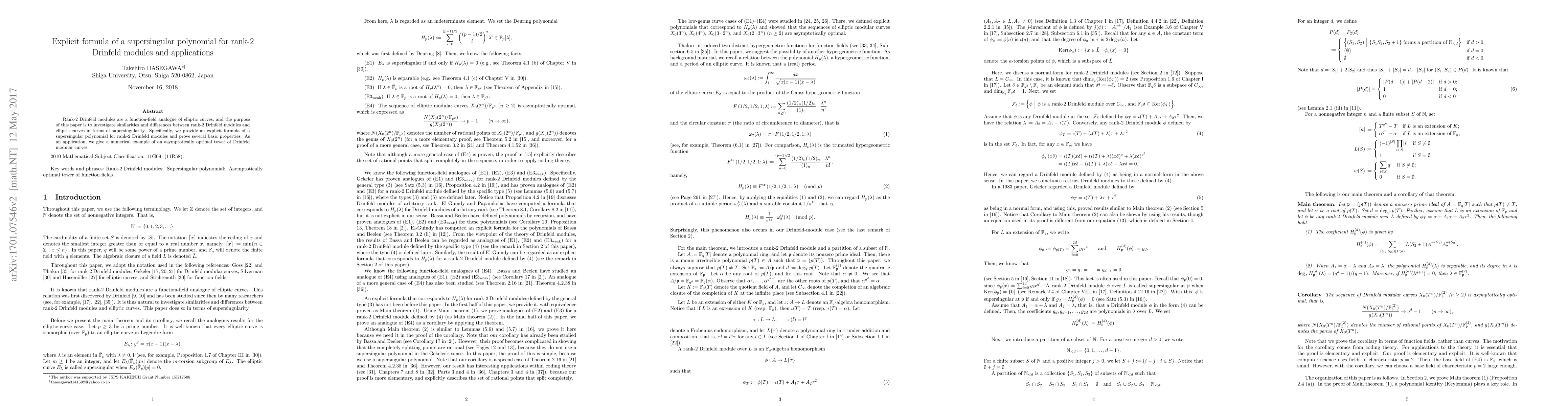This paper develops an explicit formula for a supersingular polynomial associated with rank-2 Drinfeld modules, drawing parallels to elliptic curves, and uses this to construct an asymptotically optimal tower of Drinfeld modular curves.