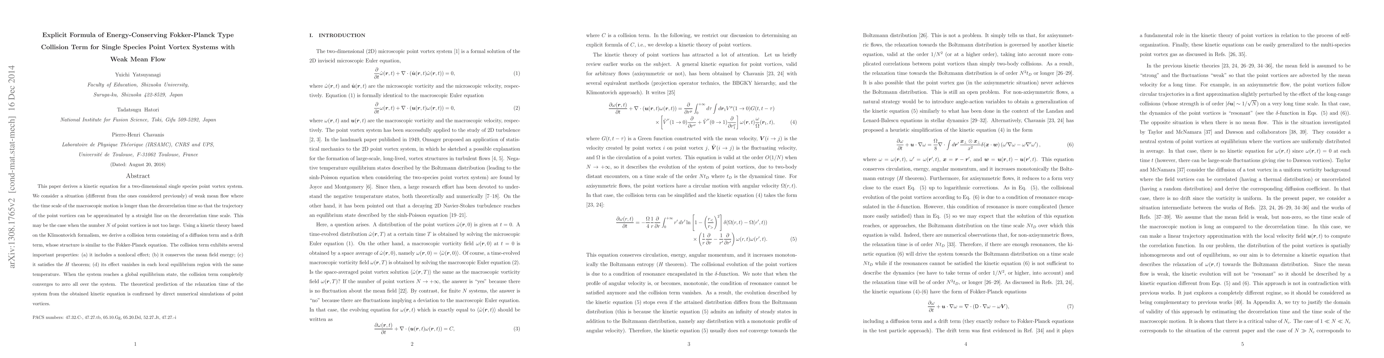 This paper derives a kinetic equation for a two-dimensional single species point vortex system. We consider a situation (different from the ones considered previously) of weak mean flow where the time scale of the macroscopic motion is longer than the decorrelation time so that the trajectory of the point vortices can be approximated by a straight line on the decorrelation time scale. This may be the case when the number $N$ of point vortices is not too large. Using a kinetic theory based on the Klimontovich formalism, we derive a collision term consisting of a diffusion term and a drift term, whose structure is similar to the Fokker-Planck equation. The collision term exhibits several important properties: (a) it includes a nonlocal effect; (b) it conserves the mean field energy; (c) it satisfies the H theorem; (d) its effect vanishes in each local equilibrium region with the same temperature. When the system reaches a global equilibrium state, the collision term completely converges to zero all over the system.