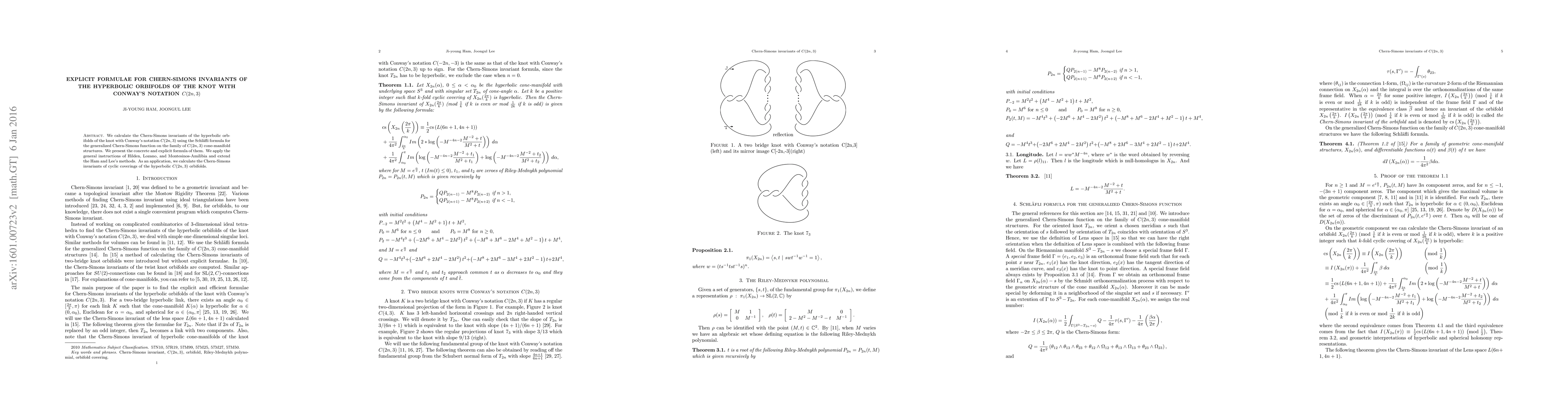 This paper derives explicit formulae for Chern-Simons invariants of hyperbolic orbifolds associated with the knot denoted by Conway's notation $C(2n, 3)$. It utilizes the Schläfli formula and extends methods from Hilden, Lozano, and Montesinos-Amilibia to compute these invariants for cyclic coverings of these orbifolds.