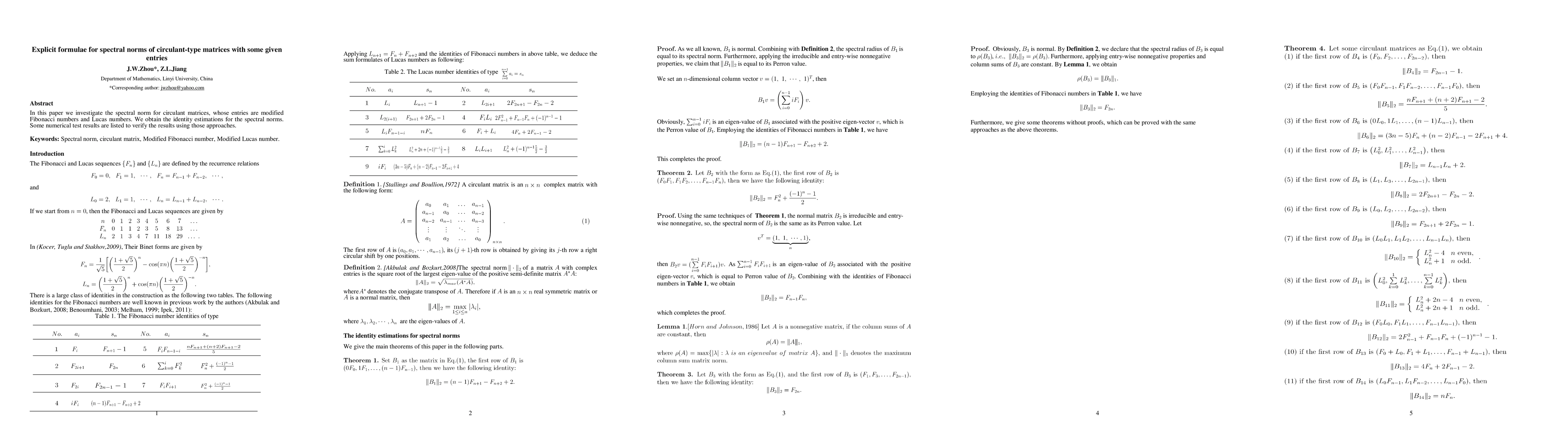 This paper develops explicit formulae for the spectral norms of circulant matrices with entries modified using Fibonacci and Lucas numbers. The derived identity estimations are validated through numerical tests.
