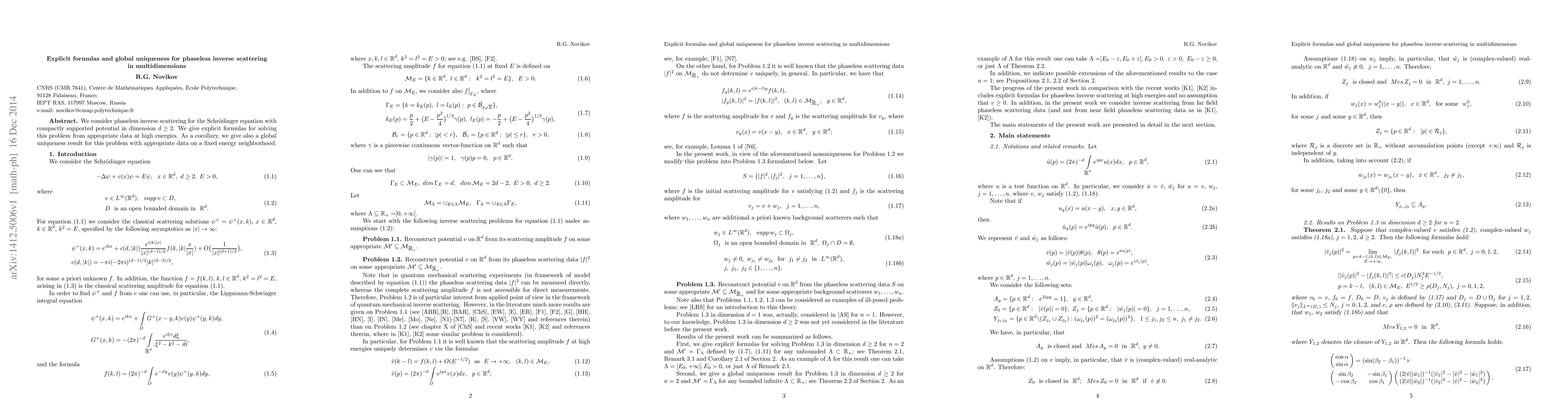 This paper provides explicit formulas for solving phaseless inverse scattering problems for the Schrödinger equation in multidimensions, and establishes global uniqueness under specific data conditions at high energies.