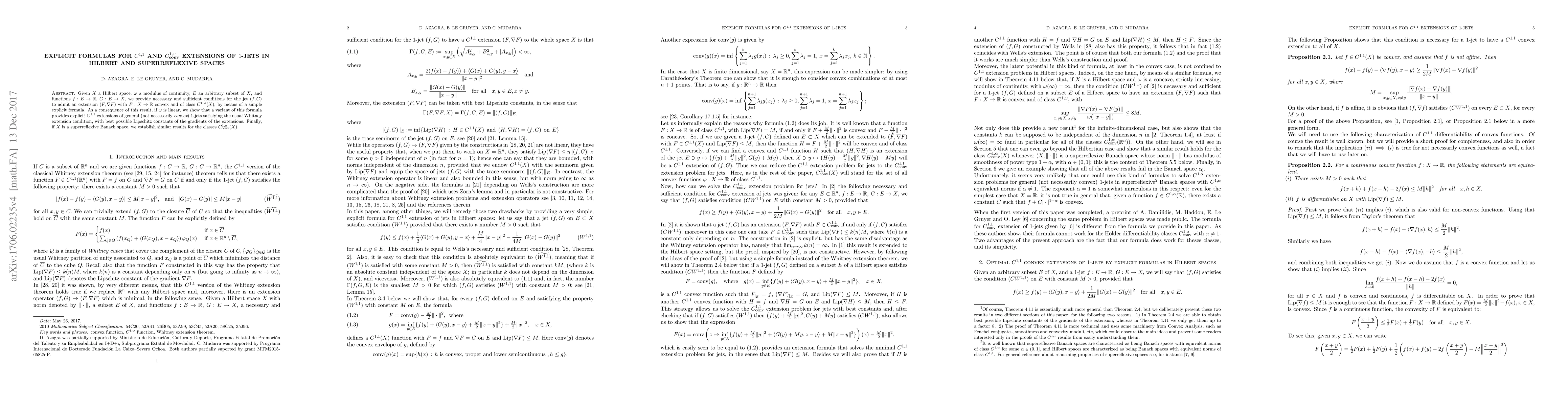 This paper provides explicit formulas for extending $C^{1, 1}$ and $C^{1, ext{conv}}$ jets in Hilbert and superreflexive spaces, with necessary and sufficient conditions for the extensions to be convex and of class $C^{1, ext{ extomega}}(X)$.