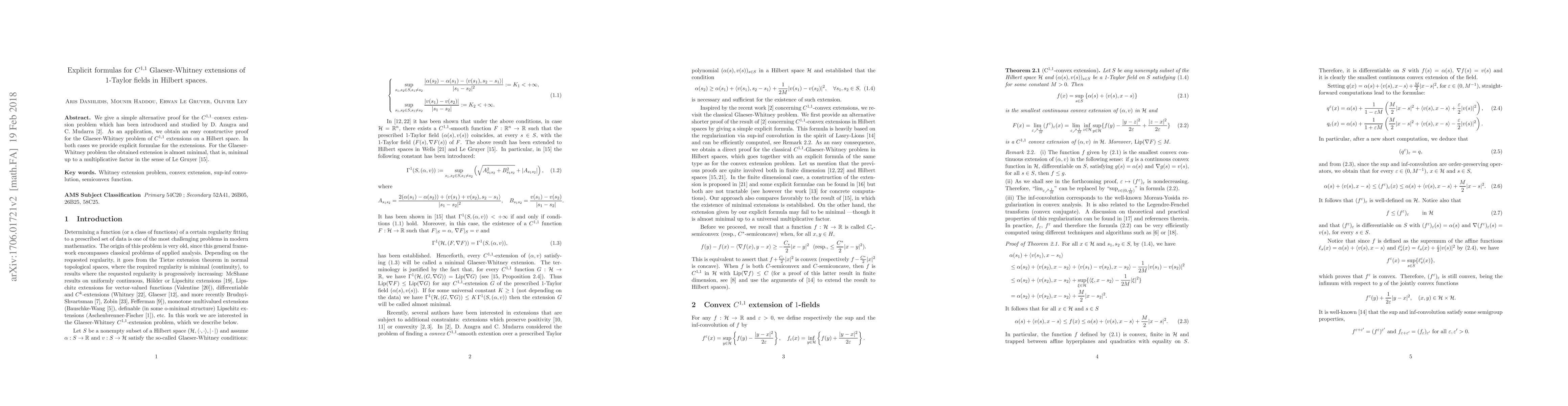 We give a simple alternative proof for the $C^{1,1}$--convex extension problem which has been introduced and studied by D. Azagra and C. Mudarra [2]. As an application, we obtain an easy constructive proof for the Glaeser-Whitney problem of $C^{1,1}$ extensions on a Hilbert space. In both cases we provide explicit formulae for the extensions. For the Gleaser-Whitney problem the obtained extension is almost minimal, that is, minimal up to a factor $\frac{1+\sqrt{3}}{2}$ in the sense of Le Gruyer [15].