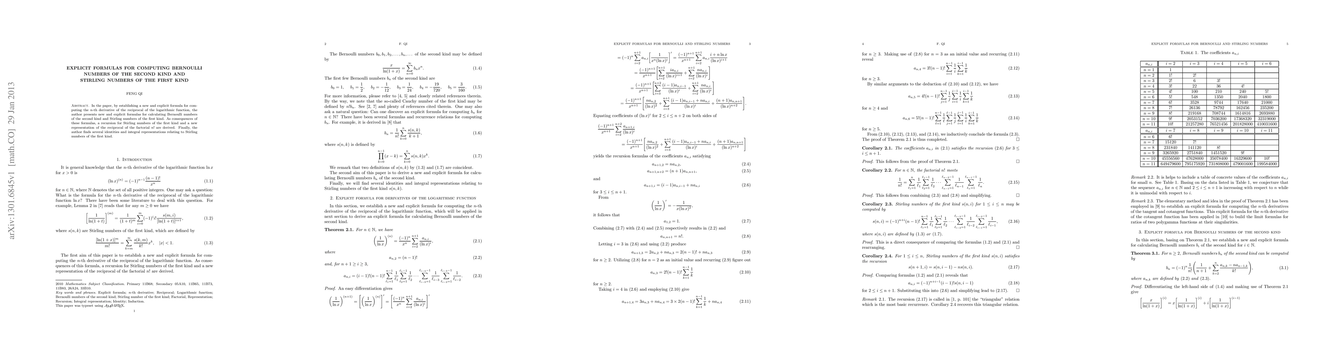 The paper introduces explicit formulas for Bernoulli numbers of the second kind and Stirling numbers of the first kind, derived from a new formula for the $n$-th derivative of the reciprocal of the logarithmic function. It also presents a recursion for Stirling numbers and integral representations relating to them.