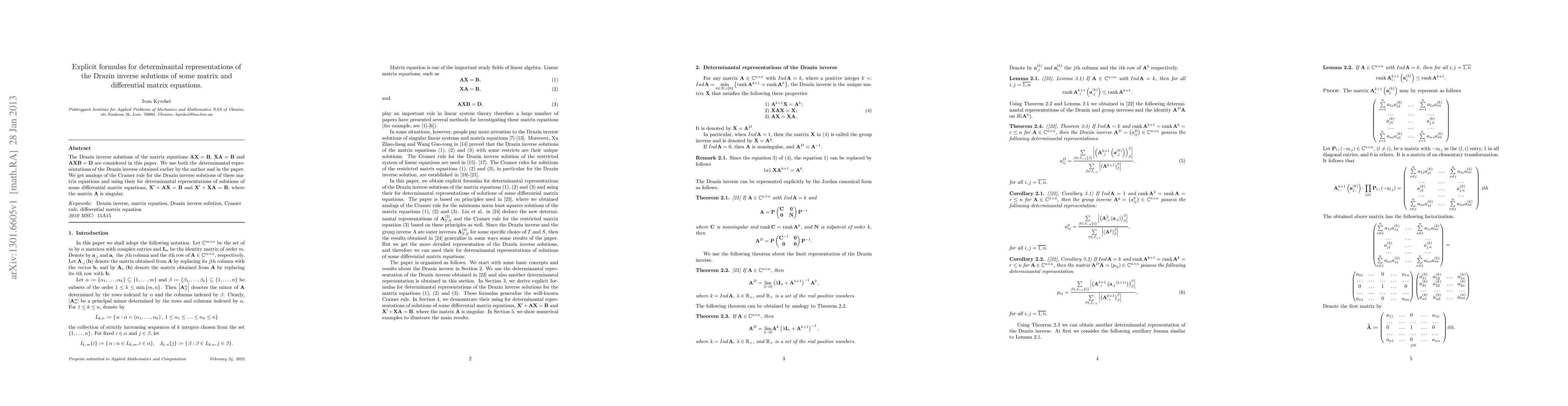 This paper investigates the Drazin inverse solutions for several matrix equations, deriving explicit formulas for their determinantal representations. It also extends these findings to provide analogous solutions for certain singular differential matrix equations.