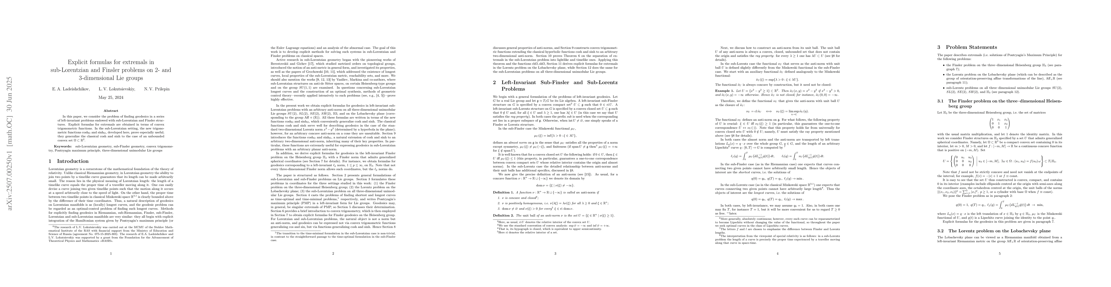In this paper, we consider the problem of finding geodesics in a series of left-invariant problems endowed with sub-Lorentzian and Finsler structures. Explicit formulas for extremals are obtained in terms of convex trigonometric functions. In the sub-Lorentzian setting, the new trigonometric functions $\cosh_\Omega$ and $\sinh_\Omega$, developed here, prove especially useful; they generalize the classical $\cosh$ and $\sinh$ to the case of an unbounded convex set $\Omega\subset\mathbb{R}^2$.