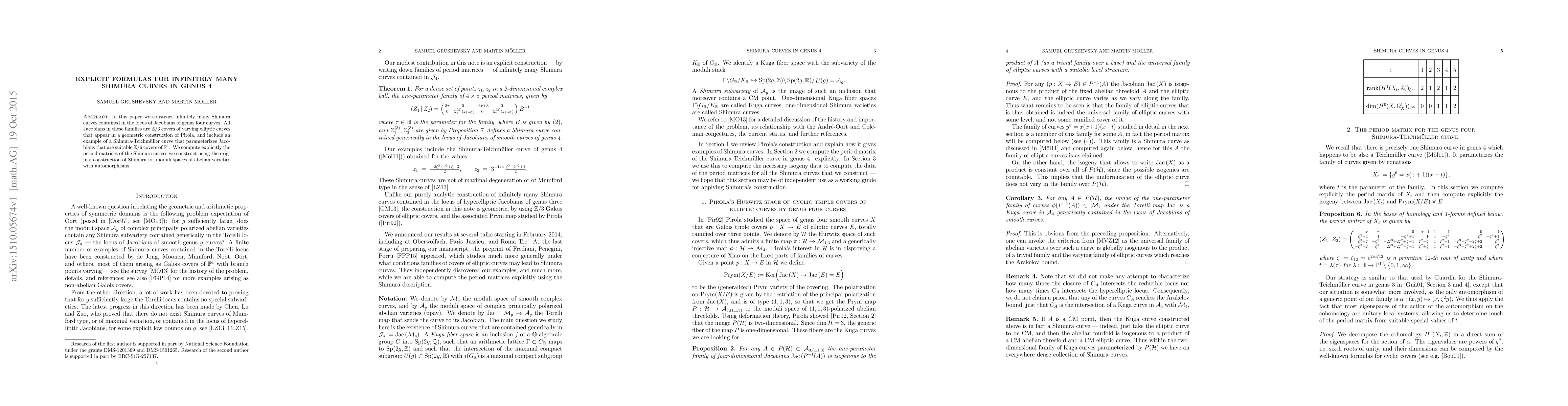 This paper constructs infinitely many Shimura curves in genus four, showing they are $ \mathbb{Z}/3$ covers of elliptic curves from Pirola's geometric construction, and includes a specific example of a Shimura-Teichmüller curve. Explicit period matrices for these curves are computed using Shimura's original method for moduli spaces of abelian varieties.