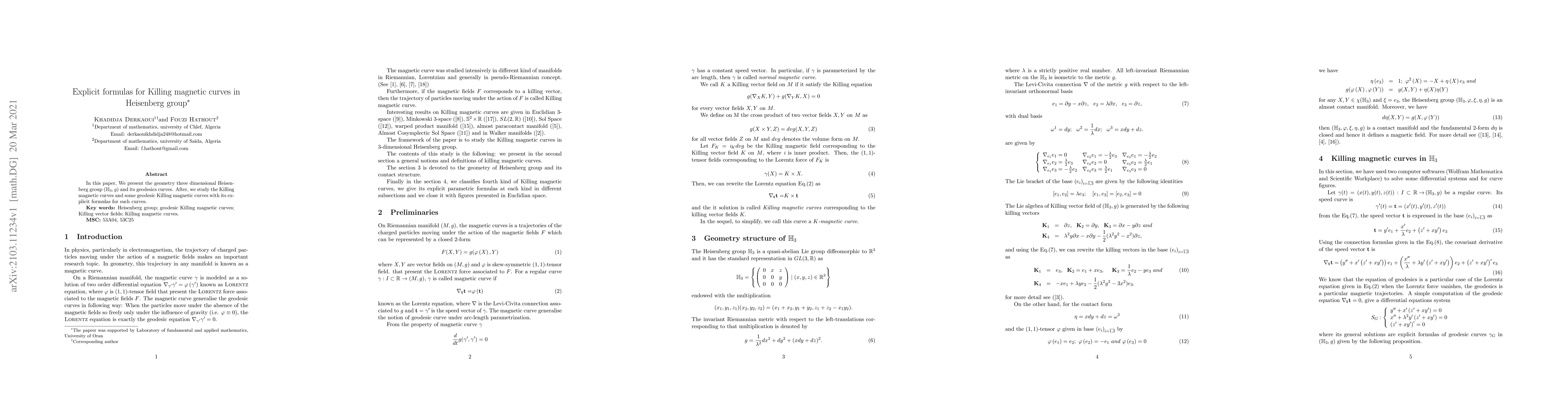 This paper explores the geometry of the three-dimensional Heisenberg group (H_3, g) and its geodesics, focusing on Killing magnetic curves and presenting explicit formulas for these curves, including some geodesic Killing magnetic curves.