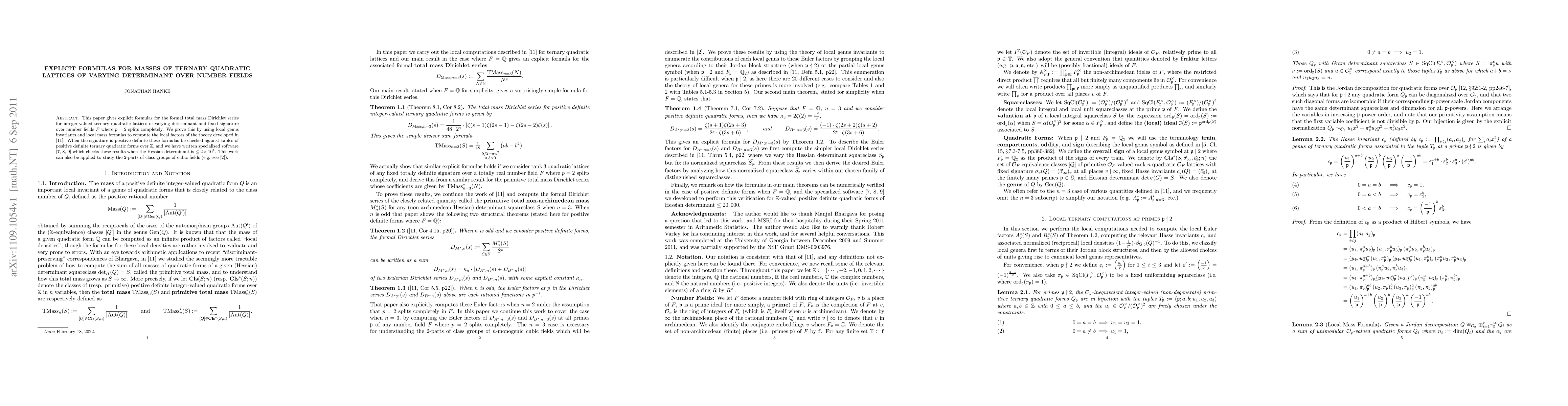 This paper provides explicit formulas for the total mass of ternary quadratic lattices over number fields where 2 splits completely, using local genus invariants and mass formulas. The results are verified against known tables of positive definite forms and can be applied to study class groups of cubic fields.