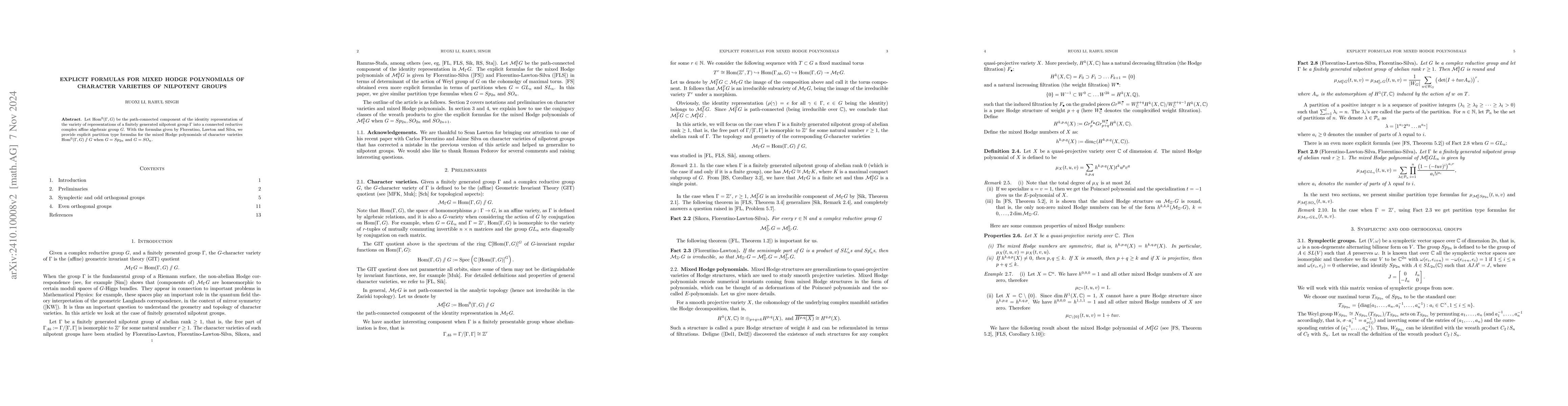 Summary: This paper presents explicit partition formulas for mixed Hodge polynomials of character varieties of nilpotent groups, specifically for representations into symplectic and special orthogonal groups using results from Florentino, Lawton, and Silva.