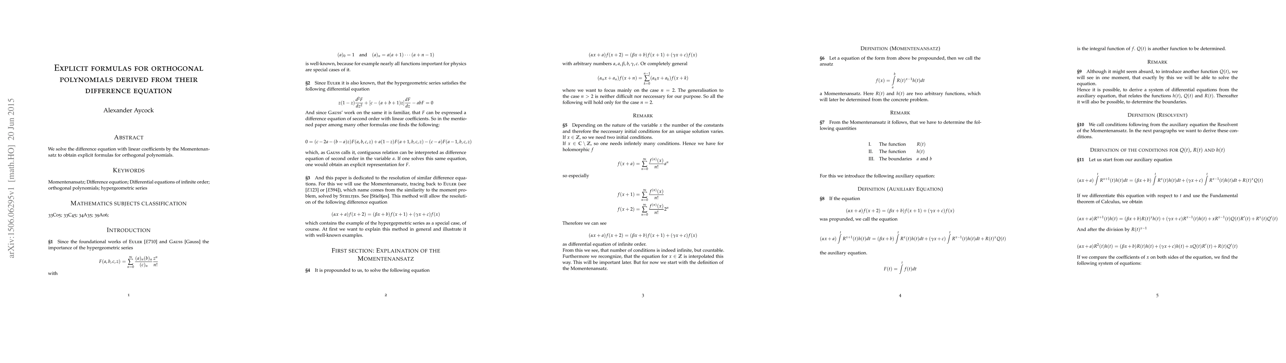 Researchers derived explicit formulas for orthogonal polynomials using a method called Momentenansatz to solve their difference equation with linear coefficients.