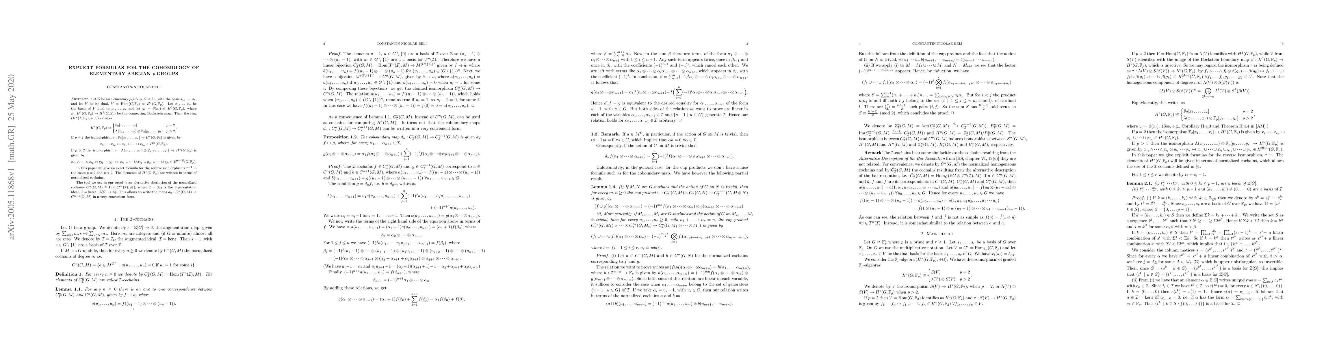 Let $G$ be an elementary abelian $p$-group, $G\cong{\mathbb F}_p^r$ and let $s_1,\ldots,s_r$ be a basis of $G$ over ${\mathbb F}_p$. Let $V$ be the dual of $G$, $V={\rm Hom}(G,{\mathbb F}_p)=H^1(G,{\mathbb F}_p)$. Let $x_1,\ldots,x_r$ be the basis of $V$ over ${\mathbb F}_p$ which is dual to the basis $s_1,\ldots,s_r$ of $G$. For $1\leq i\leq r$ we denote by $y_i=\beta (x_i)\in H^2(G,{\mathbb F}_p)$, where $\beta :H^1(G,{\mathbb F}_p)\to H^2(G,{\mathbb F}_p)$ is the connecting Bockstein map. The ring $(H^*(G,{\mathbb F}_p),+,\cup )$ satisfies $$H^*(G,{\mathbb F}_p)\cong\begin{cases}{\mathbb F}_p[x_1,\ldots,x_r]&p=2\\ \Lambda (x_1,\ldots,x_r)\otimes{\mathbb F}_p[y_1,\ldots,y_r]&p>2\end{cases}.$$ When $p=2$ the isomorphism $\tau :{\mathbb F}_p[x_1,\ldots,x_r]\to H^*(G,{\mathbb F}_p)$ is given by $x_{i_1}\cdots x_{i_n}\mapsto x_{i_1}\cup\cdots\cup x_{i_n}\in H^n(G,{\mathbb F}_p)$. When $p>3$ the isomorphism $\tau :\Lambda (x_1,\ldots,x_r)\otimes{\mathbb F}_p[y_1,\ldots,y_r]\to H^*(G,{\mathbb F}_p)$ is given by $x_{i_1}\wedge\cdots\wedge x_{i_l}\otimes y_{j_1}\cdots y_{j_k}\mapsto x_{i_1}\cup\cdots\cup x_{i_l}\cup y_{j_1}\cup\cdots\cup y_{j_k}\in H^{2k+l}(G,{\mathbb F}_p)$. In this paper we give explicit formulas for the inverse isomorphism $\tau^{-1}$. The elements of $H^*(G,{\mathbb F}_p)$ are written in terms of normalized cochains. During the proof we use an alternative way to describe the normalized cochains. Namely, for every $G$-module $M$ we have $C^n(G,M)\cong{\rm Hom}(T^n({\mathcal I}),M)$, where ${\mathcal I}$ is the augmented ideal of $G$, ${\mathcal I}=\ker\varepsilon :{\mathbb Z}[G]\to{\mathbb Z}$.