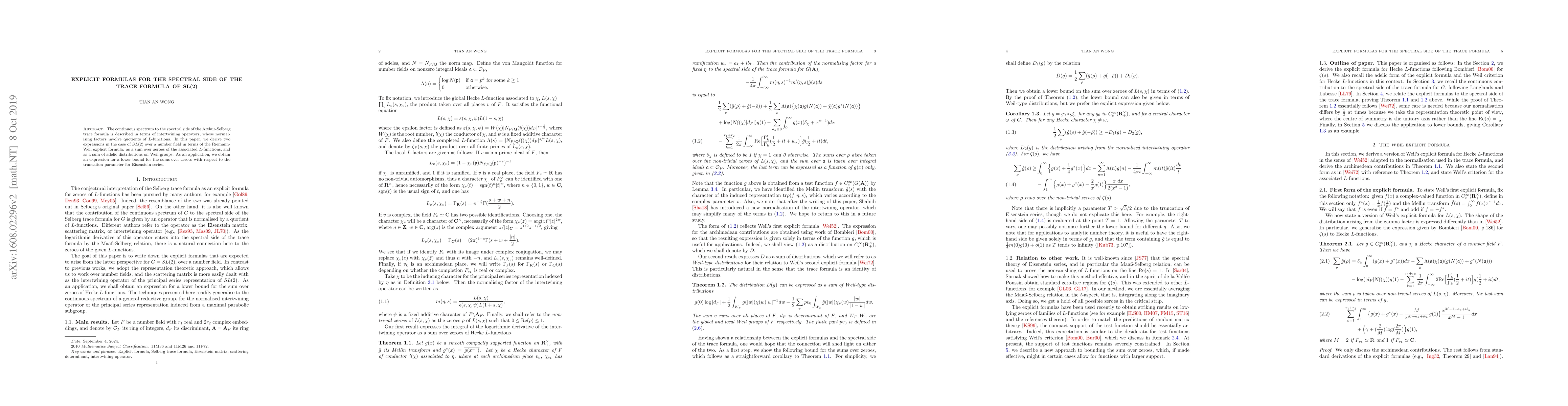 This paper provides explicit formulas for the spectral side of the trace formula for SL(2) over a number field, expressing the continuous spectrum in terms of intertwining operators and $L$-functions. It derives two expressions based on the Riemann-Weil explicit formula and applies these to obtain a lower bound for sums over zeroes of associated $L$-functions.