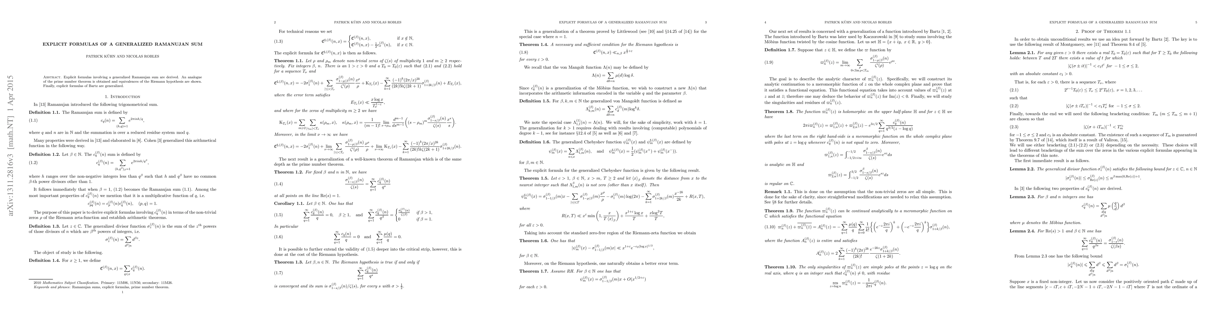 This paper derives explicit formulas involving a generalized Ramanujan sum and establishes an analogue of the prime number theorem. It also demonstrates equivalences of the Riemann hypothesis and generalizes explicit formulas of Bartz.