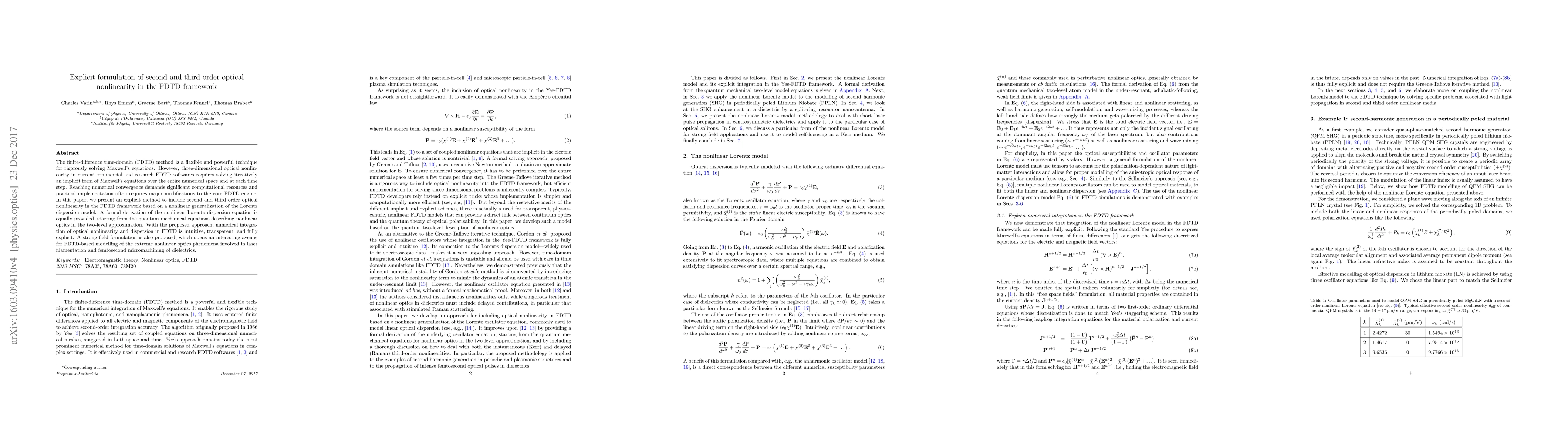 This paper proposes an explicit method to include second and third order optical nonlinearity in the FDTD framework using a nonlinear generalization of the Lorentz dispersion model, making it intuitive and transparent for numerical integration.