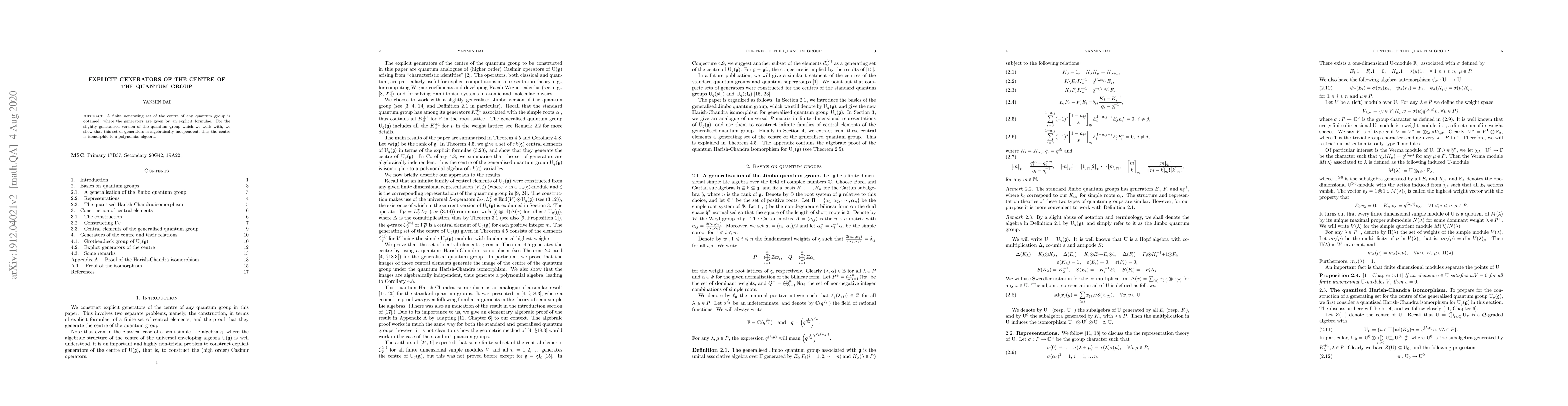 For a slightly generalised version of the Jimbo quantum group associated with any finite dimensional simple Lie algebra $\mathfrak{g}$, we show that its centre is a polynomial algebra. We construct a set of algebraically independent central elements, each associated with a fundamental weight of $\mathfrak{g}$, and prove that they generate the entire centre of the quantum group. A key ingredient in the proofs of these results is a quantum Harish-Chandra isomorphism for the generalised quantum group, which is proven in some details.