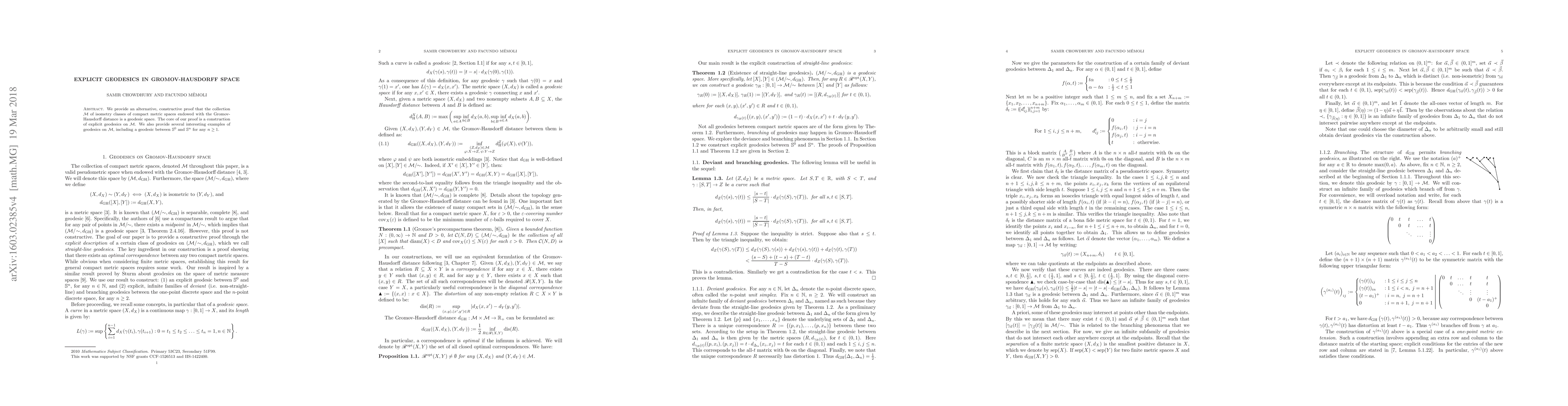 We provide an alternative, constructive proof that the collection $\mathcal{M}$ of isometry classes of compact metric spaces endowed with the Gromov-Hausdorff distance is a geodesic space. The core of our proof is a construction of explicit geodesics on $\mathcal{M}$. We also provide several interesting examples of geodesics on $\mathcal{M}$, including a geodesic between $\mathbb{S}^0$ and $\mathbb{S}^n$ for any $n\geq 1$.