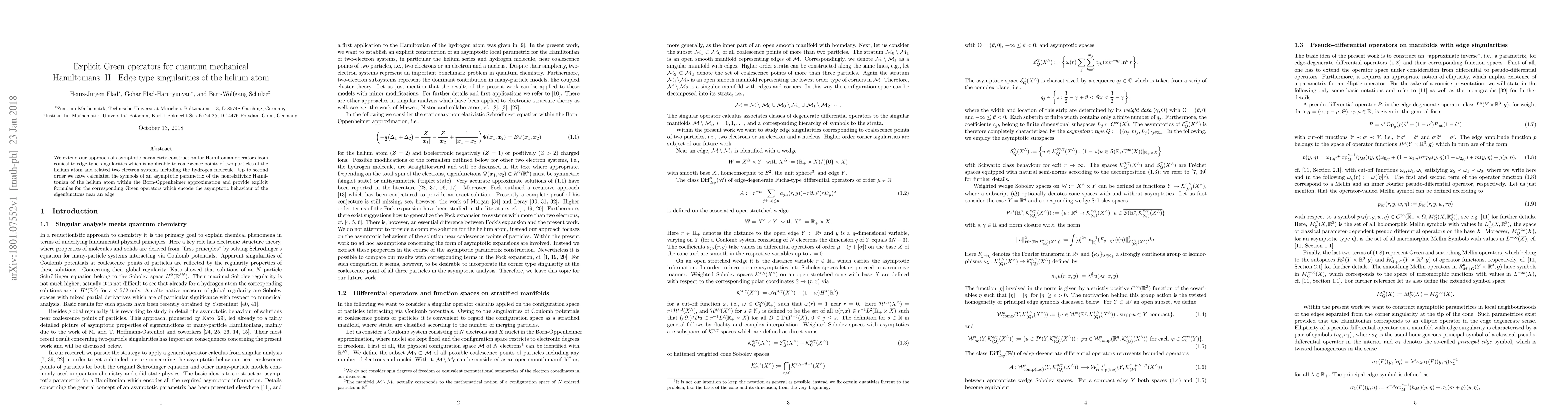 We extend our approach of asymptotic parametrix construction for Hamiltonian operators from conical to edge-type singularities which is applicable to coalescence points of two particles of the helium atom and related two electron systems including the hydrogen molecule. Up to second order we have calculated the symbols of an asymptotic parametrix of the nonrelativisic Hamiltonian of the helium atom within the Born-Oppenheimer approximation and provide explicit formulas for the corresponding Green operators which encode the asymptotic behaviour of the eigenfunctons near an edge.