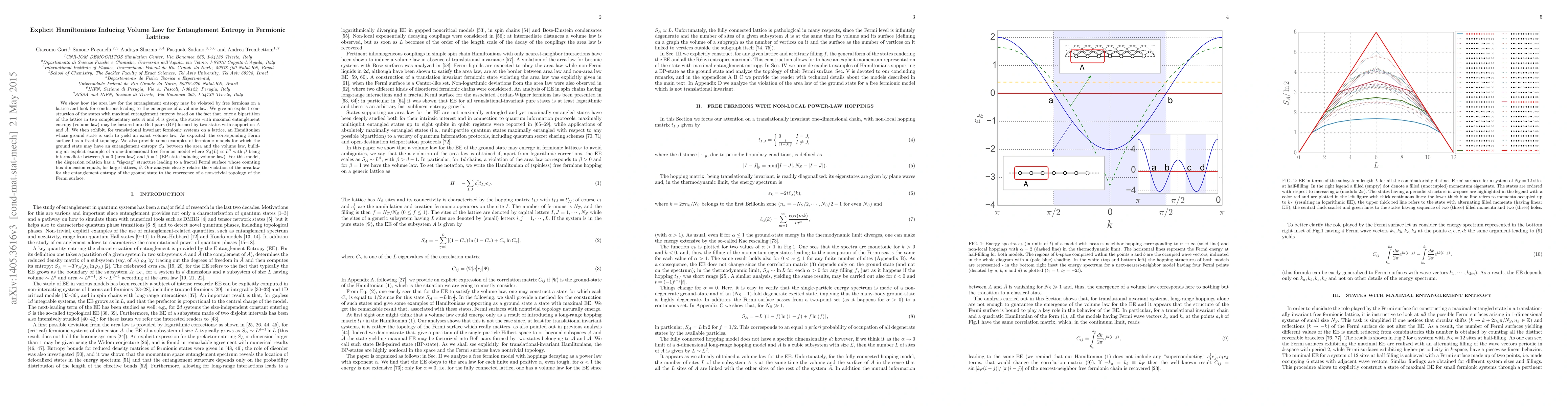 This paper constructs explicit Hamiltonians for fermionic lattice systems that induce a volume law for entanglement entropy, demonstrating how the area law can be violated. It provides an example of a one-dimensional free fermion model with a fractal Fermi surface, showing an intermediate entanglement entropy scaling between area and volume law.
