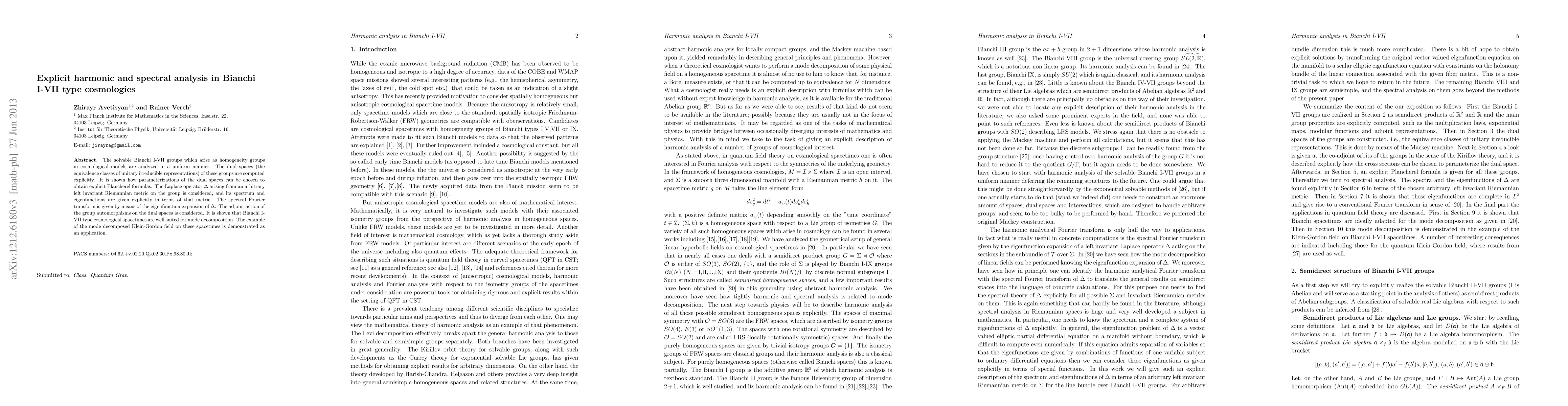This paper analyzes Bianchi I-VII type cosmologies using harmonic and spectral analysis, providing explicit formulas for the Laplace operator's spectrum and eigenfunctions in terms of a left-invariant Riemannian metric.
