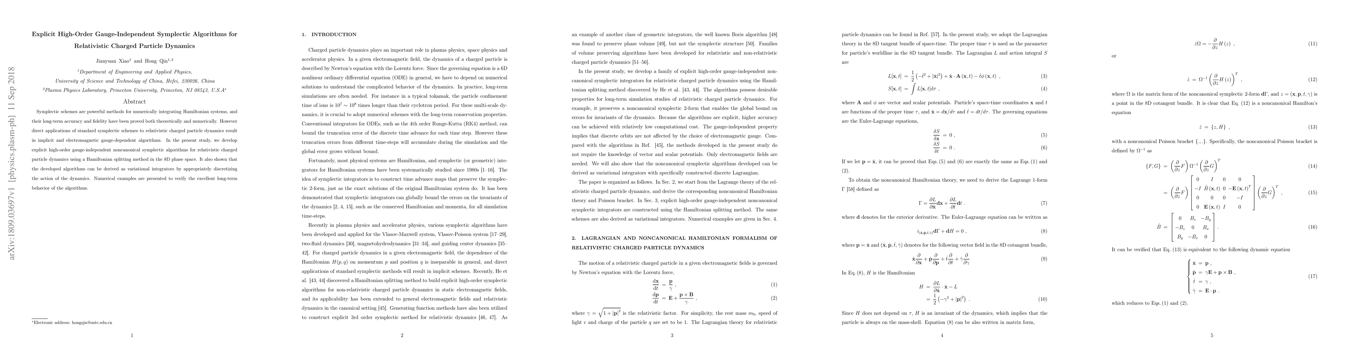 This paper develops explicit high-order gauge-independent symplectic algorithms for relativistic charged particle dynamics using a Hamiltonian splitting method. The proposed algorithms are shown to be variational integrators and exhibit excellent long-term accuracy and fidelity, as demonstrated through numerical examples.