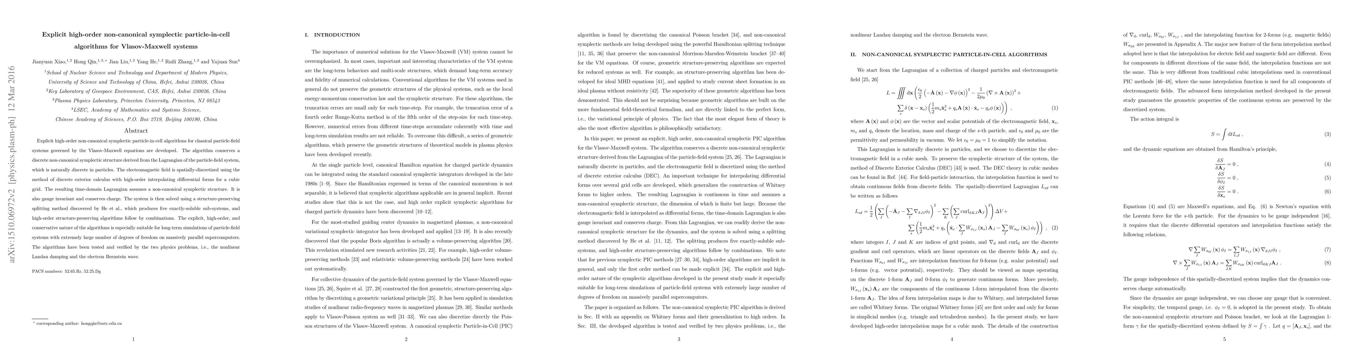 Explicit high-order non-canonical symplectic particle-in-cell algorithms for classical particle-field systems governed by the Vlasov-Maxwell equations are developed. The algorithm conserves a discrete non-canonical symplectic structure derived from the Lagrangian of the particle-field system, which is naturally discrete in particles. The electromagnetic field is spatially-discretized using the method of discrete exterior calculus with high-order interpolating differential forms for a cubic grid. The resulting time-domain Lagrangian assumes a non-canonical symplectic structure. It is also gauge invariant and conserves charge. The system is then solved using a splitting method discovered by He et al., which produces five exactly-soluable sub-systems, and high-order structure- preserving algorithms follow by combinations. The explicit, high-order, and conservative nature of the algorithms is especially suitable for long-term simulations of particle-field systems with extremely large number of degrees of freedom on massively parallel supercomputers. The algorithms have been tested and verified by the two physics problems, i.e., the nonlinear Landau damping and the electron Bernstein wave.