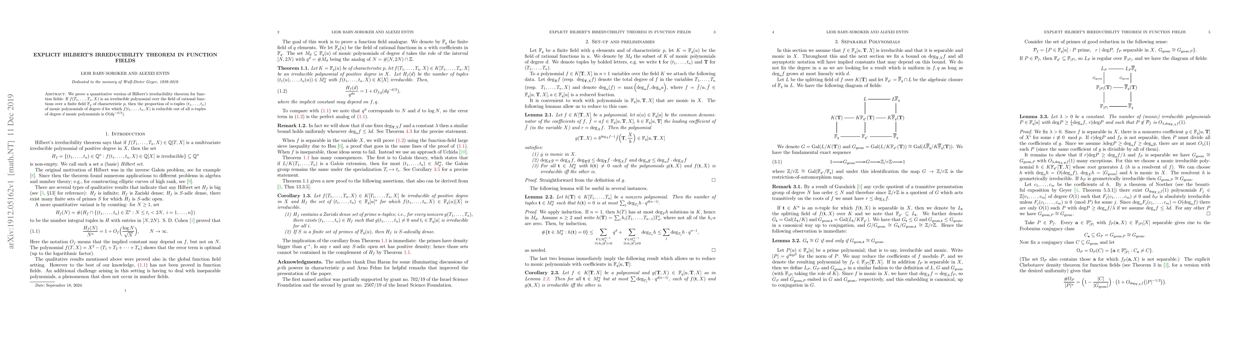 This paper proves a quantitative version of Hilbert's irreducibility theorem for function fields, demonstrating that the proportion of tuples making an irreducible polynomial reducible is bounded by $O(dq^{-d/2})$. This extends classical irreducibility results to algebraic function fields.