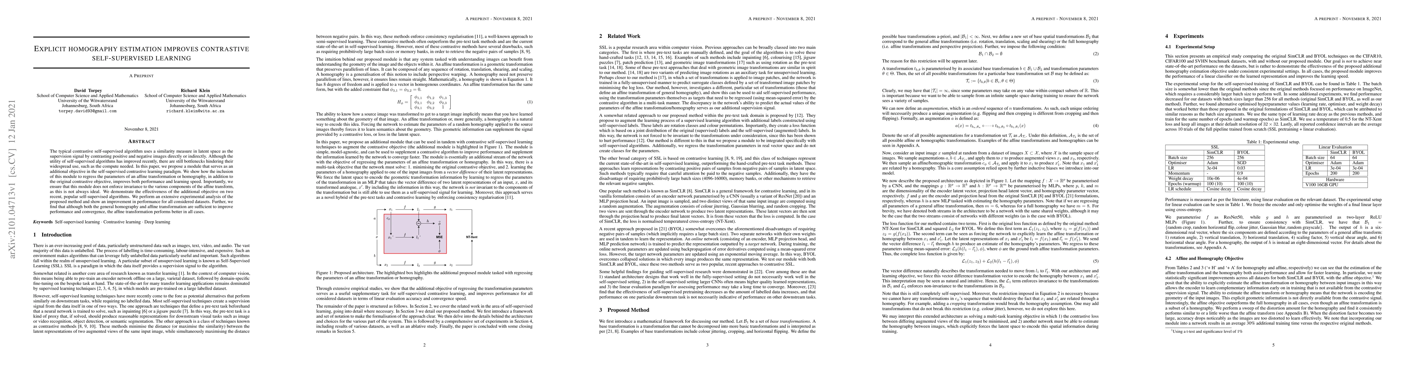 The typical contrastive self-supervised algorithm uses a similarity measure in latent space as the supervision signal by contrasting positive and negative images directly or indirectly. Although the utility of self-supervised algorithms has improved recently, there are still bottlenecks hindering their widespread use, such as the compute needed. In this paper, we propose a module that serves as an additional objective in the self-supervised contrastive learning paradigm. We show how the inclusion of this module to regress the parameters of an affine transformation or homography, in addition to the original contrastive objective, improves both performance and learning speed. Importantly, we ensure that this module does not enforce invariance to the various components of the affine transform, as this is not always ideal. We demonstrate the effectiveness of the additional objective on two recent, popular self-supervised algorithms. We perform an extensive experimental analysis of the proposed method and show an improvement in performance for all considered datasets. Further, we find that although both the general homography and affine transformation are sufficient to improve performance and convergence, the affine transformation performs better in all cases.