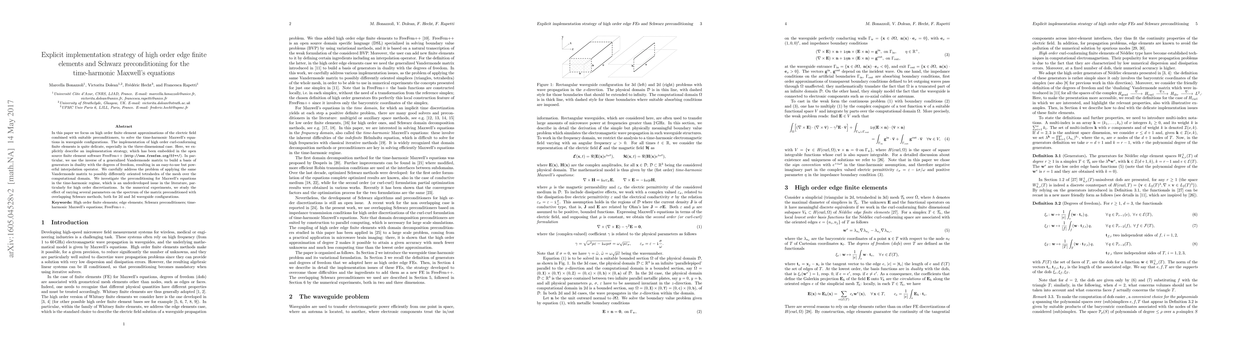 This paper presents an explicit implementation strategy for high order edge finite elements and Schwarz preconditioning to solve time-harmonic Maxwell's equations in waveguides. The implementation leverages FreeFem++ and uses a generalized Vandermonde matrix for an efficient interpolation operator, addressing challenges in three-dimensional cases and exploring preconditioning effects in numerical experiments.