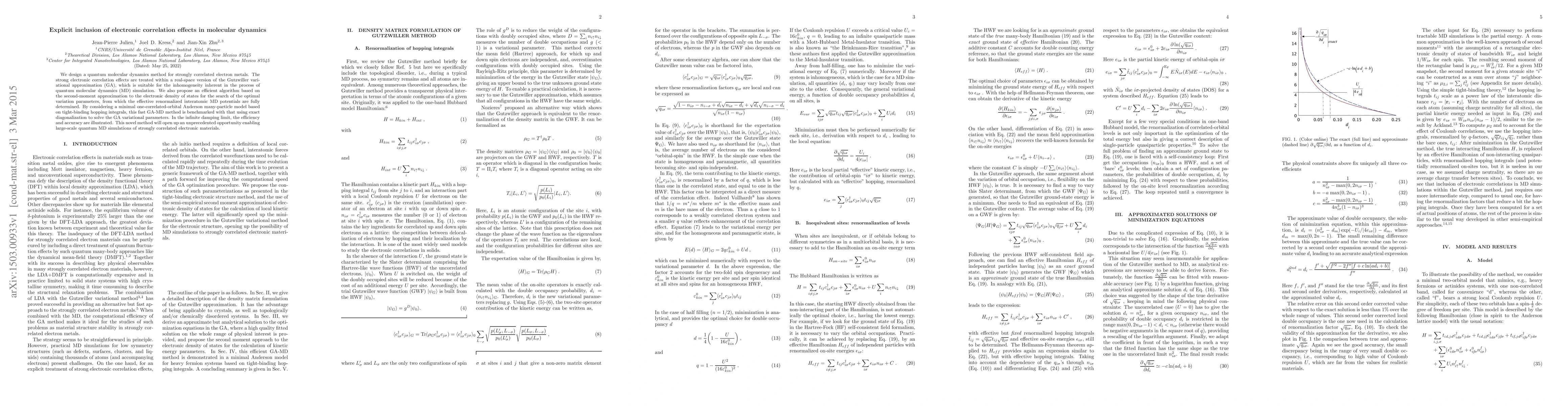 We design a quantum molecular dynamics method for strongly correlated electron metals. The strong electronic correlation effects are treated within a real-space version of the Gutzwiller variational approximation (GA), which is suitable for the inhomogeneity inherent in the process of quantum molecular dynamics (MD) simulation. We also propose an efficient algorithm based on the second-moment approximation to the electronic density of states for the search of the optimal variation parameters, from which the effective renormalized interatomic MD potentials are fully determined. By considering a minimal one-correlated-orbital Anderson many-particle model based on tight-binding hopping integrals, this fast GA-MD method is benchmarked with that using exact diagonalization to solve the GA variational parameters. In the infinite damping limit, the efficiency and accuracy are illustrated. This novel method will open up an unprecedented opportunity enabling large-scale quantum MD simulations of strongly correlated electronic materials.