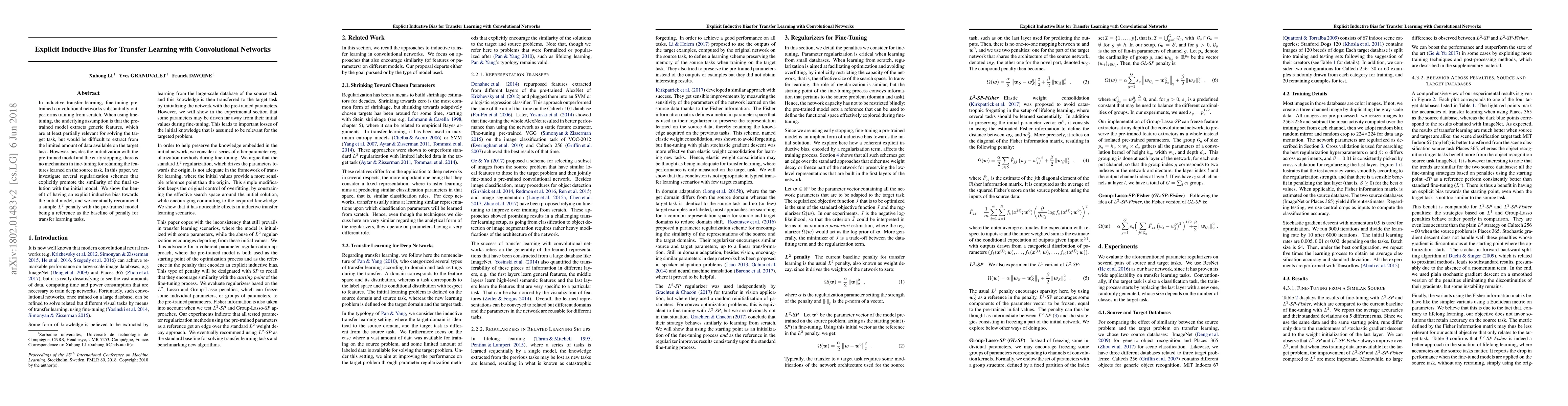 In inductive transfer learning, fine-tuning pre-trained convolutional networks substantially outperforms training from scratch. When using fine-tuning, the underlying assumption is that the pre-trained model extracts generic features, which are at least partially relevant for solving the target task, but would be difficult to extract from the limited amount of data available on the target task. However, besides the initialization with the pre-trained model and the early stopping, there is no mechanism in fine-tuning for retaining the features learned on the source task. In this paper, we investigate several regularization schemes that explicitly promote the similarity of the final solution with the initial model. We show the benefit of having an explicit inductive bias towards the initial model, and we eventually recommend a simple $L^2$ penalty with the pre-trained model being a reference as the baseline of penalty for transfer learning tasks.