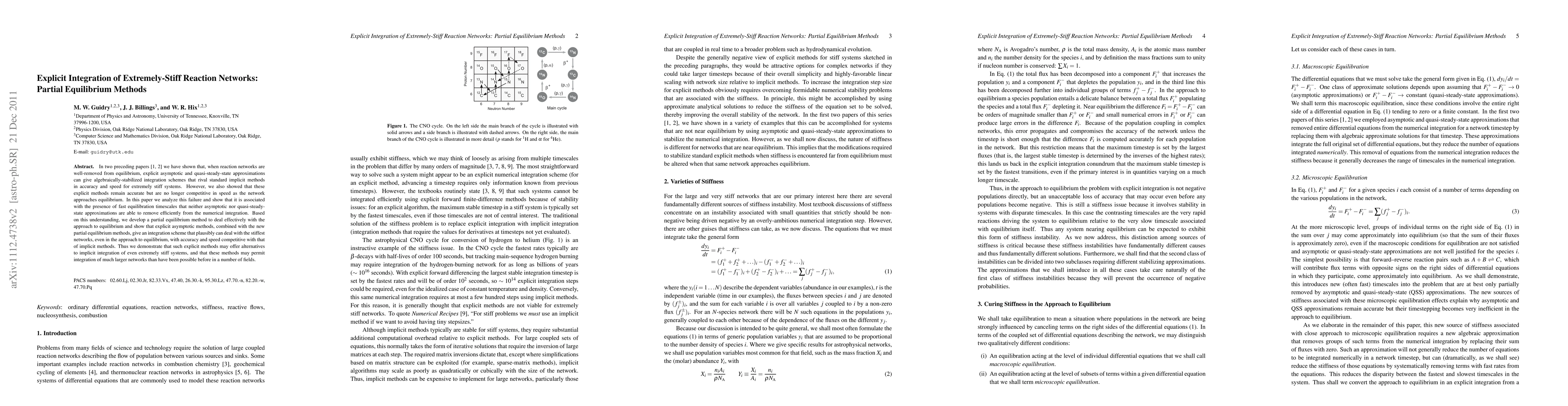 In two preceding papers we have shown that, when reaction networks are well-removed from equilibrium, explicit asymptotic and quasi-steady-state approximations can give algebraically-stabilized integration schemes that rival standard implicit methods in accuracy and speed for extremely stiff systems. However, we also showed that these explicit methods remain accurate but are no longer competitive in speed as the network approaches equilibrium. In this paper we analyze this failure and show that it is associated with the presence of fast equilibration timescales that neither asymptotic nor quasi-steady-state approximations are able to remove efficiently from the numerical integration. Based on this understanding, we develop a partial equilibrium method to deal effectively with the approach to equilibrium and show that explicit asymptotic methods, combined with the new partial equilibrium methods, give an integration scheme that plausibly can deal with the stiffest networks, even in the approach to equilibrium, with accuracy and speed competitive with that of implicit methods. Thus we demonstrate that such explicit methods may offer alternatives to implicit integration of even extremely stiff systems, and that these methods may permit integration of much larger networks than have been possible before in a number of fields.