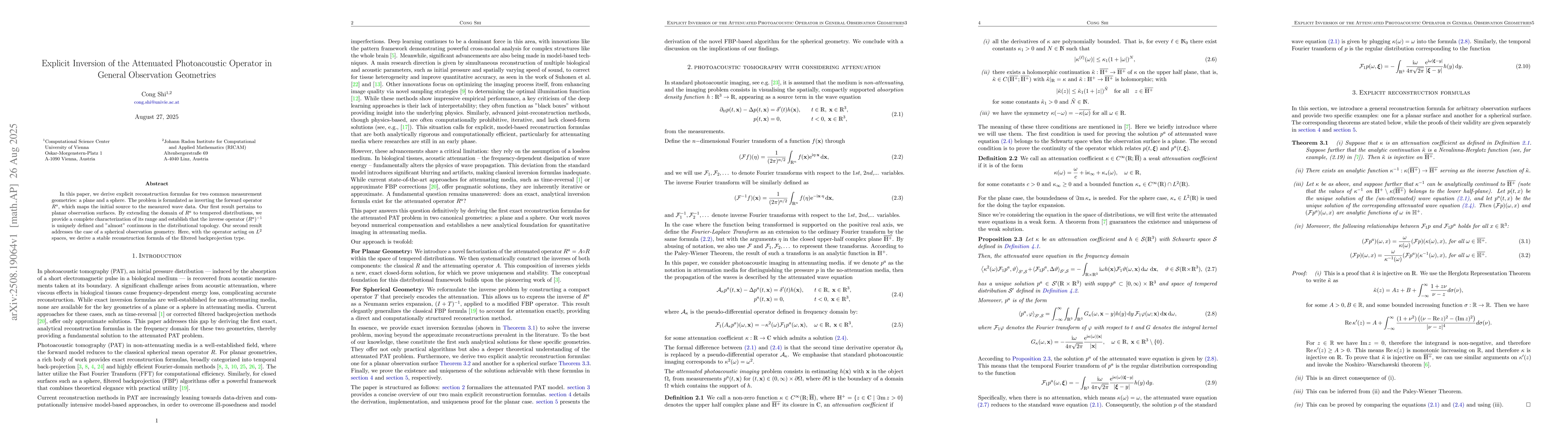 In this paper, we derive explicit reconstruction formulas for two common measurement geometries: a plane and a sphere. The problem is formulated as inverting the forward operator $R^a$, which maps the initial source to the measured wave data. Our first result pertains to planar observation surfaces. By extending the domain of $R^a$ to tempered distributions, we provide a complete characterization of its range and establish that the inverse operator $(R^a)^{-1}$ is uniquely defined and "almost" continuous in the distributional topology. Our second result addresses the case of a spherical observation geometry. Here, with the operator acting on $L^2$ spaces, we derive a stable reconstruction formula of the filtered backprojection type.