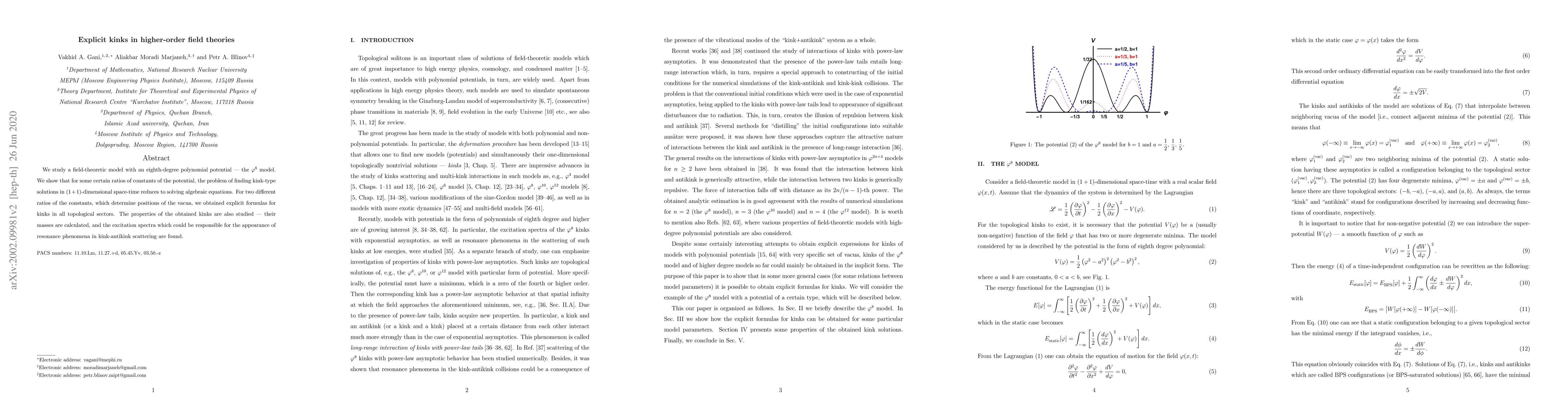 Researchers found explicit formulas for kink solutions in a higher-order field theory model with an eighth-degree polynomial potential, which helps understand resonance phenomena in kink-antikink scattering.