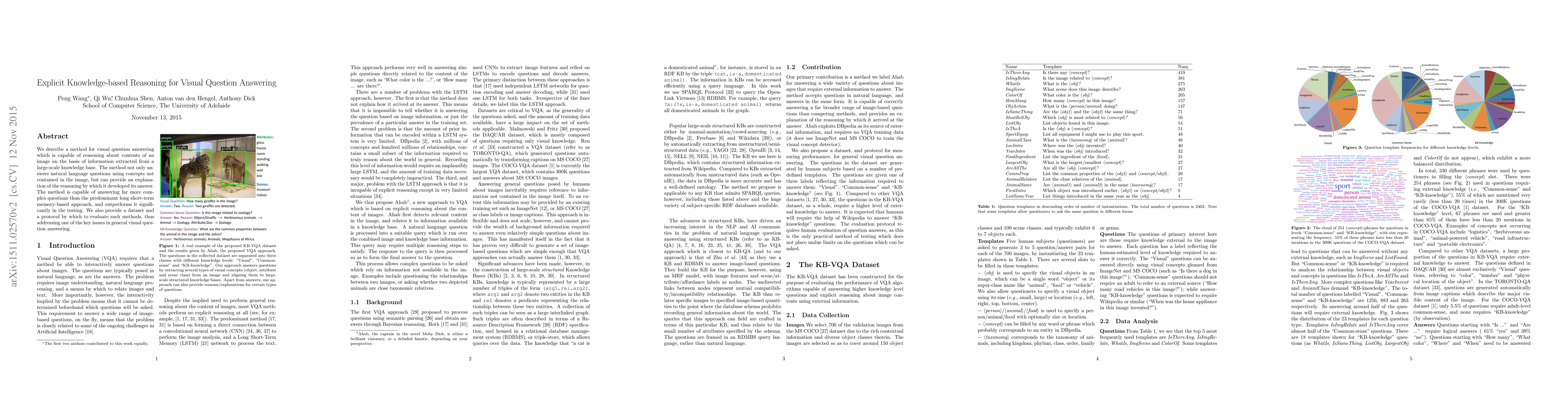 This paper proposes a method for visual question answering that leverages explicit knowledge from a large-scale knowledge base to reason about image contents, providing answers and explanations for complex questions beyond the scope of traditional LSTM-based approaches. The method is shown to outperform existing techniques and includes a new dataset and evaluation protocol for visual question answering research.
