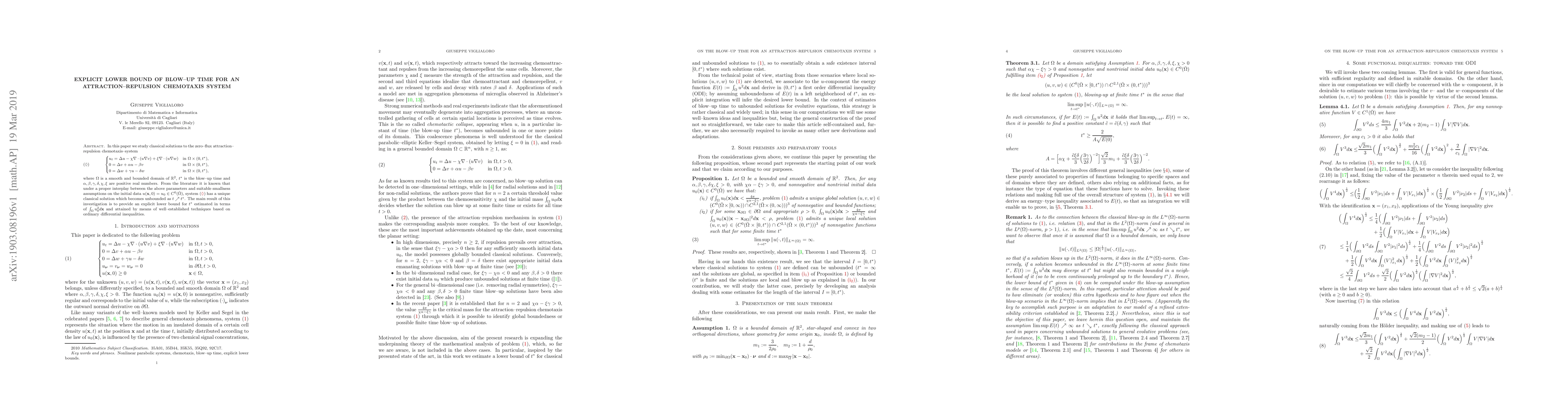 This paper studies a chemotaxis system that attracts and repels particles, finding an explicit lower bound for the time it takes to reach maximum concentration.