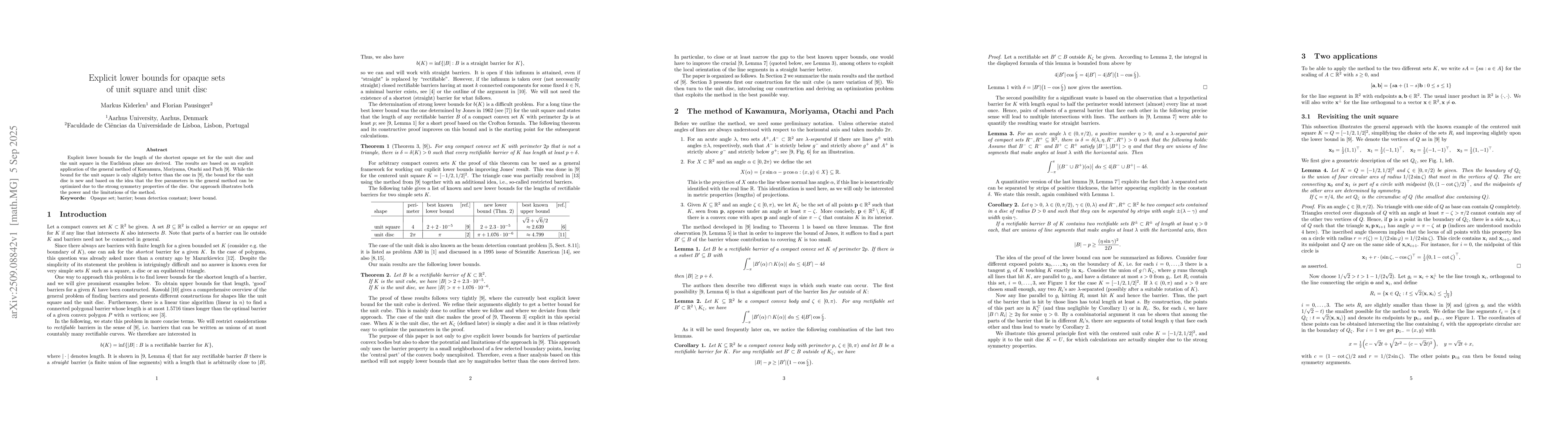 Explicit lower bounds for the length of the shortest opaque set for the unit disc and the unit square in the Euclidean plane are derived. The results are based on an explicit application of the general method of Kawamura, Moriyama, Otachi and Pach. While the bound for the unit square only slightly improves the existing bound, the bound for the unit disc is new and based on the idea that the free parameters in the general method can be optimized due to the strong symmetry properties of the disc. Our approach illustrates both the power and the limitations of the method.