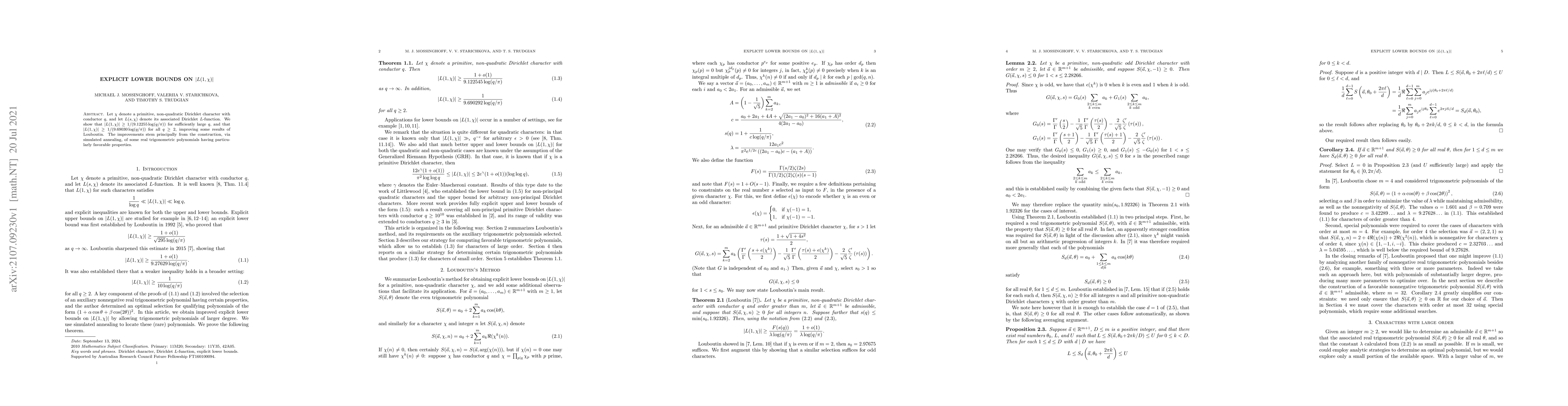 Let $\chi$ denote a primitive, non-quadratic Dirichlet character with conductor $q$, and let $L(s, \chi)$ denote its associated Dirichlet $L$-function. We show that $|L(1, \chi)| \geq 1/(9.12255 \log(q/\pi))$ for sufficiently large $q$, and that $|L(1, \chi)| \geq 1/(9.69030 \log(q/\pi))$ for all $q\geq2$, improving some results of Louboutin. The improvements stem principally from the construction, via simulated annealing, of some real trigonometric polynomials having particularly favorable properties.