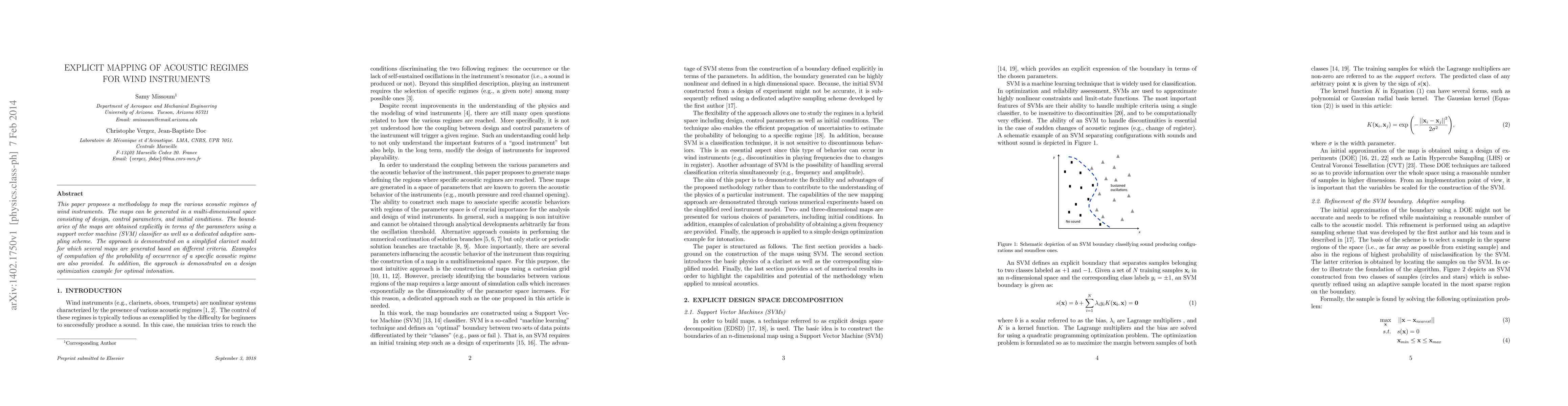 This paper proposes a methodology to map the various acoustic regimes of wind instruments. The maps can be generated in a multi-dimensional space consisting of design, control parameters, and initial conditions. The bound- aries of the maps are obtained explicitly in terms of the parameters using a support vector machine (SVM) classifier as well as a dedicated adaptive sam- pling scheme. The approach is demonstrated on a simplified clarinet model for which several maps are generated based on different criteria. Examples of computation of the probability of occurrence of a specific acoustic regime are also provided. In addition, the approach is demonstrated on a design optimization example for optimal intonation.
