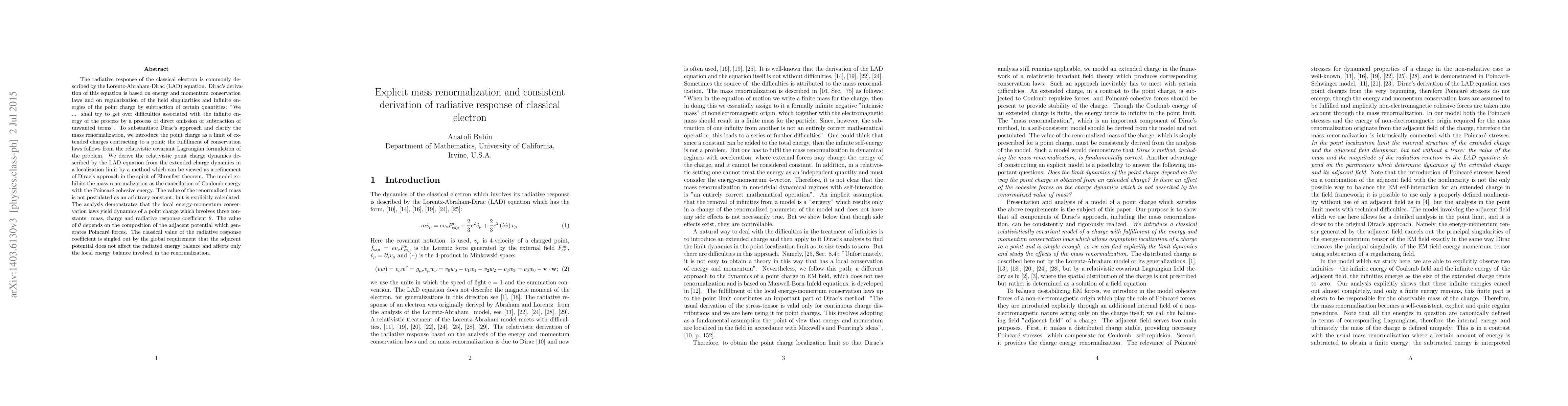 The radiative response of the classical electron is commonly described by the Lorentz-Abraham-Dirac (LAD) equation. Dirac's derivation of this equation is based on energy and momentum conservation laws and on regularization of the field singularities and infinite energies of the point charge by subtraction of certain quantities: "We ... shall try to get over difficulties associated with the infinite energy of the process by a process of direct omission or subtraction of unwanted terms". To substantiate Dirac's approach and clarify the mass renormalization, we introduce the point charge as a limit of extended charges contracting to a point; the fulfillment of conservation laws follows from the relativistic covariant Lagrangian formulation of the problem. We derive the relativistic point charge dynamics described by the LAD equation from the extended charge dynamics in a localization limit by a method which can be viewed as a refinement of Dirac's approach in the spirit of Ehrenfest theorem. The model exhibits the mass renormalization as the cancellation of Coulomb energy with the Poincar\'e cohesive energy. The value of the renormalized mass is not postulated as an arbitrary constant, but is explicitly calculated. The analysis demonstrates that the local energy-momentum conservation laws yield dynamics of a point charge which involves three constants: mass, charge and radiative response coefficient {\theta}. The value of {\theta} depends on the composition of the adjacent potential which generates Poincar\'e forces. The classical value of the radiative response coefficient is singled out by the global requirement that the adjacent potential does not affect the radiated energy balance and affects only the local energy balance involved in the renormalization.