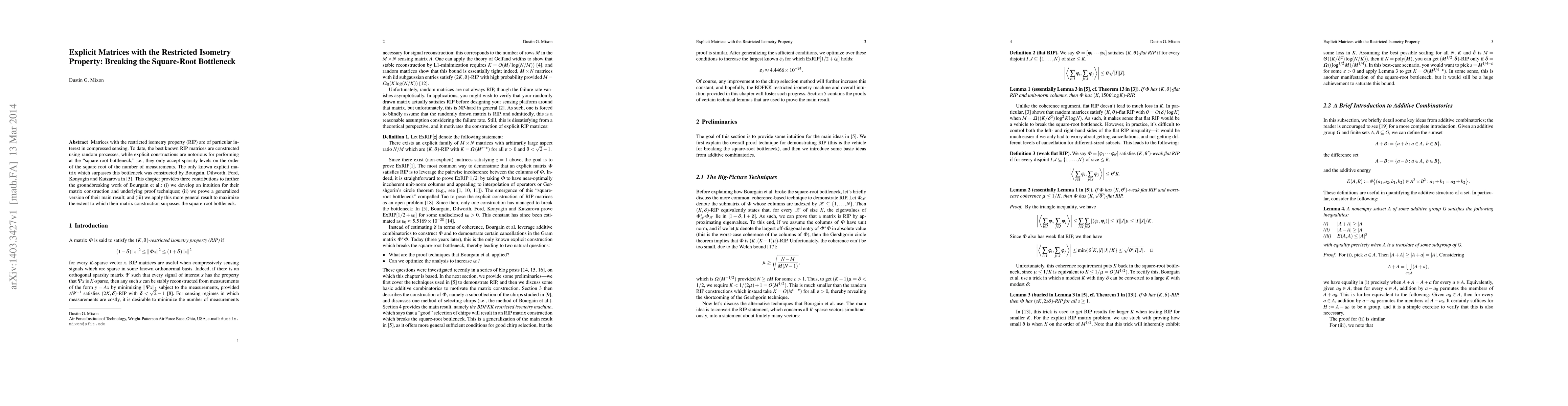 Matrices with the restricted isometry property (RIP) are of particular interest in compressed sensing. To date, the best known RIP matrices are constructed using random processes, while explicit constructions are notorious for performing at the "square-root bottleneck," i.e., they only accept sparsity levels on the order of the square root of the number of measurements. The only known explicit matrix which surpasses this bottleneck was constructed by Bourgain, Dilworth, Ford, Konyagin and Kutzarova. This chapter provides three contributions to further the groundbreaking work of Bourgain et al.: (i) we develop an intuition for their matrix construction and underlying proof techniques; (ii) we prove a generalized version of their main result; and (iii) we apply this more general result to maximize the extent to which their matrix construction surpasses the square-root bottleneck.